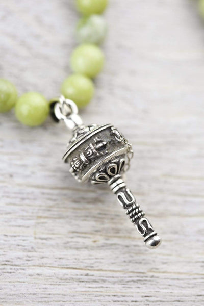 The mantra of compassion, Om Mani Padme Hum, is written in Tibetan script on the outside of the wheel along with a dorje symbol. This mantra invokes the powerful benevolent attention and blessings of Chenrezig, the embodiment of compassion. Inside the prayer wheel are scrolls containing this mantra and prayers which multiply with each turn.