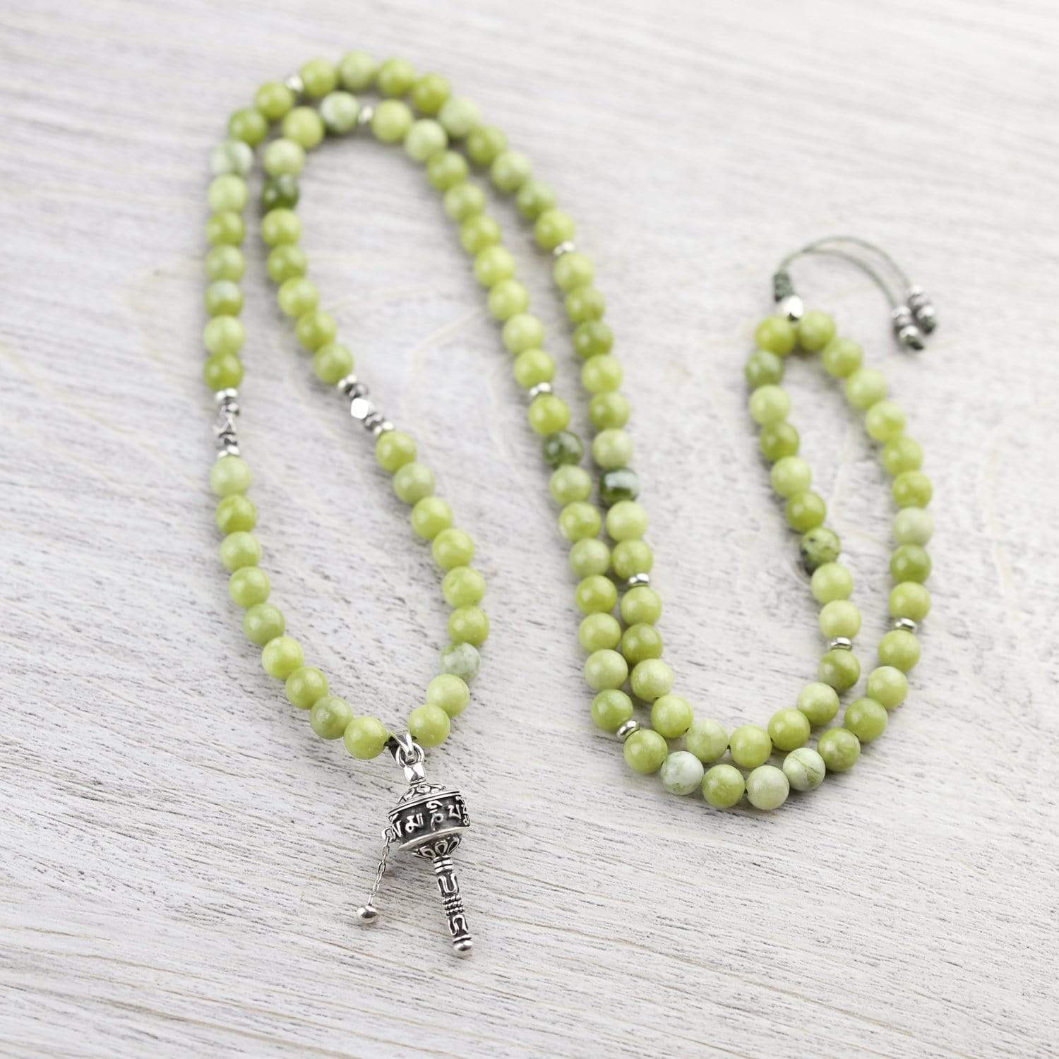 Mala measures approximately 36 inches around. Beads are 8mm. Prayer wheel is about 1.75 inches long and 0.6 inch wide.