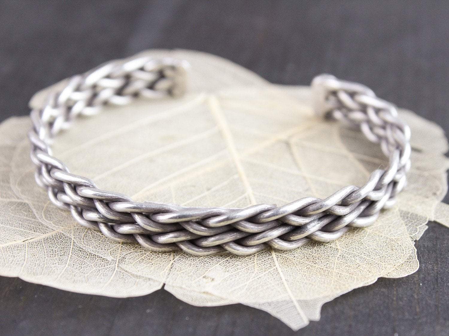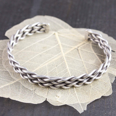 New and exclusive men's cuff bracelet made with .98 Hill Tribe silver. Features a braided design with two round endpoints. Wear it alone or stack it with some of your favorite bracelets, malas, or even a watch. This strong, bold design looks great with anything.