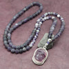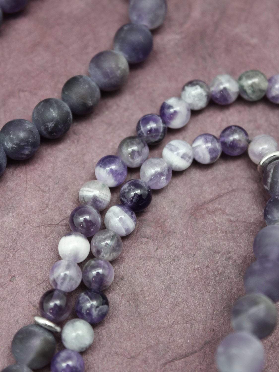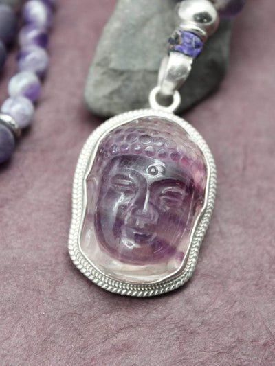 Our new and exclusive Amethyst Buddha mala is hand strung right here at the DharmaShop with materials sourced from all over the world. It features a beautiful combination of matte Amethyst and polished chevron Amethyst beads. The main focal point of the mala is the hand carved banded Amethyst meditating Buddha pendant.