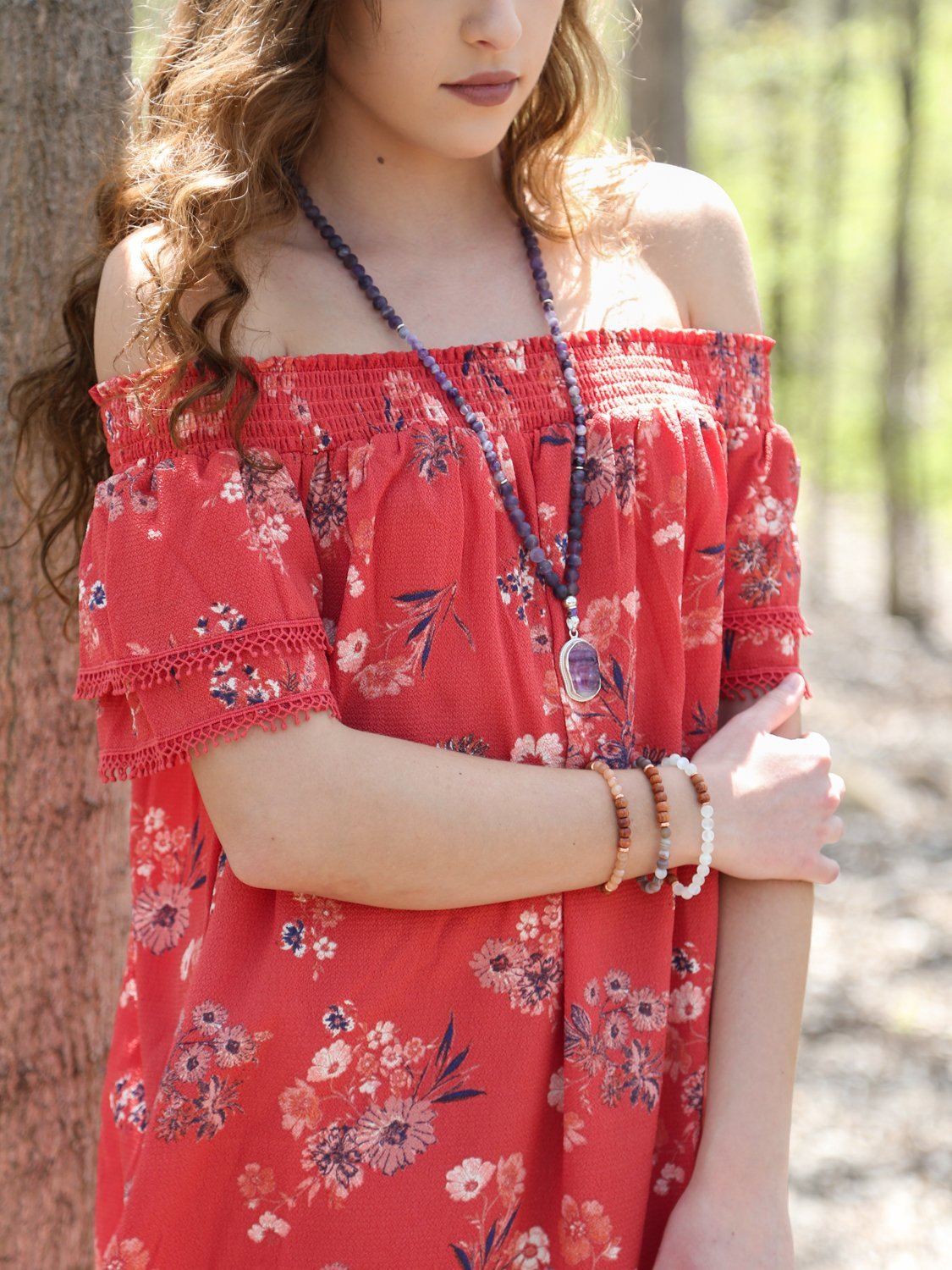 Each bead is unique and reflects its own complex swirls and bands of purple. The pendant consists of a banded Amethyst gemstone that is hand carved in Kathmandu and then placed inside of a sterling silver setting.