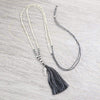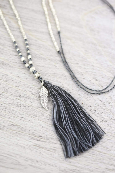 • This beautiful long necklace is strung with tiny faceted Hill Tribe silver beads on a blend of navy and steel blue cord.  A Hill Tribe silver feather pendant and matching blue tassel finish the necklace.