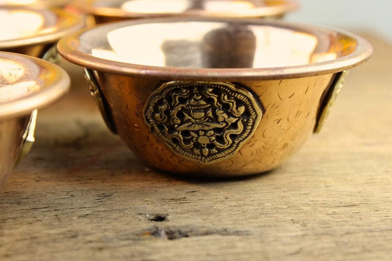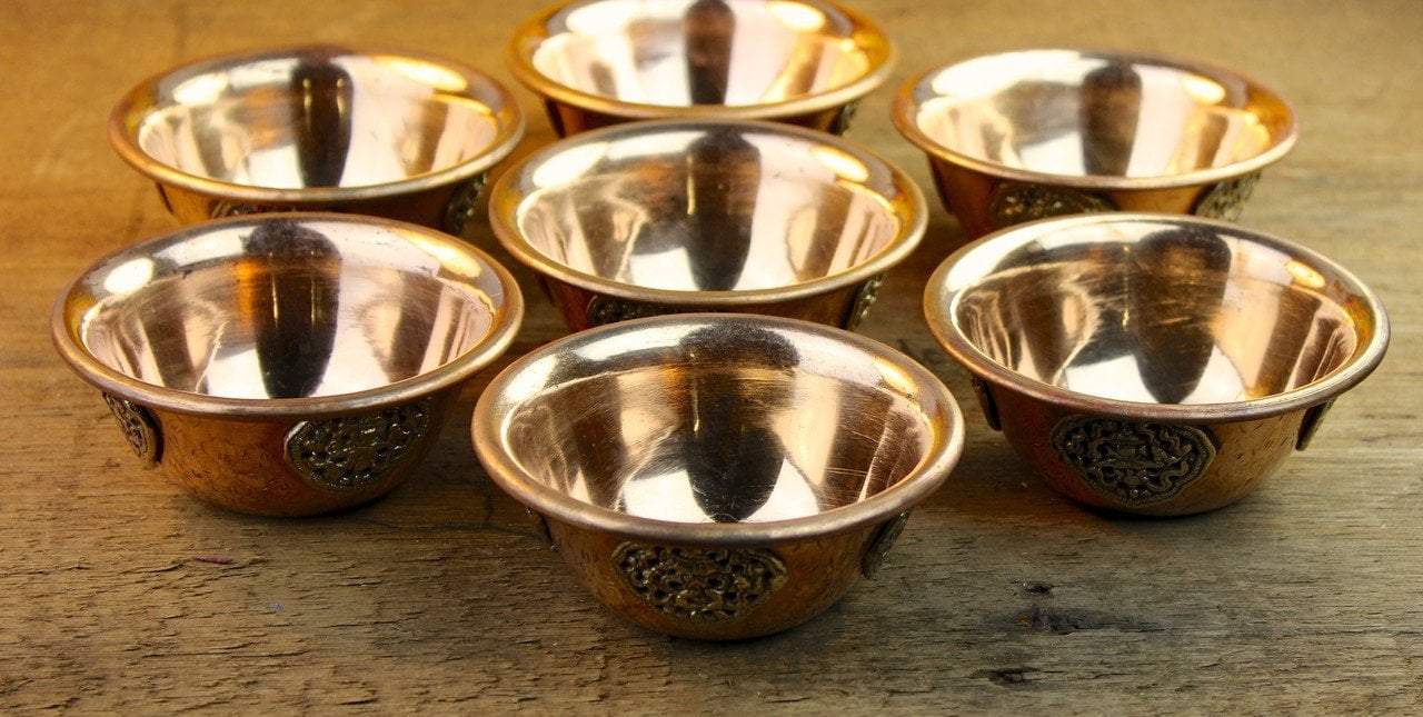 A beautiful set of seven copper offering bowls. A set of seven offering bowls may be placed on one's shrine and filled with water daily as a way of accumulating virtue and merit. Handmade in Nepal.