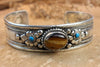 This silver plated bracelet has 2 tiny painted turquoise stones and a large tiger eye stone set in a traditional Tibetan design.