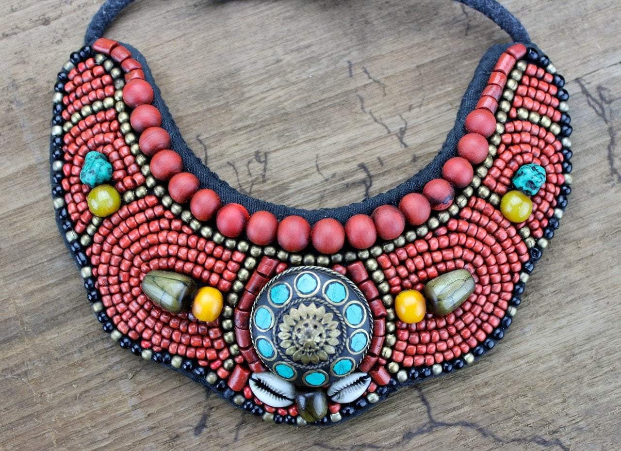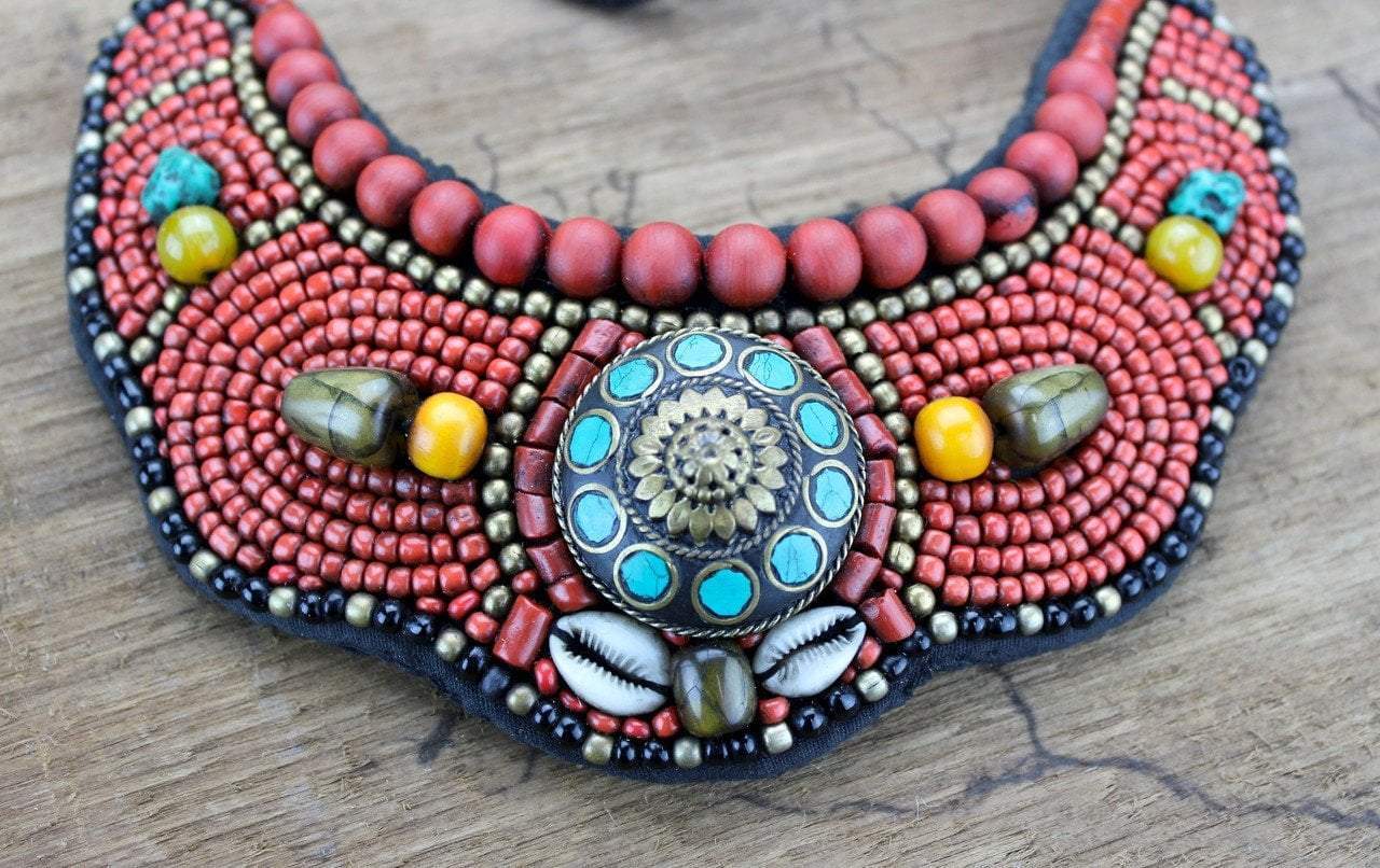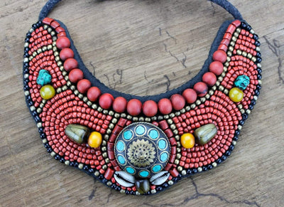 These traditional necklaces are making a comeback in Tibetan communities around the world. Ancient versions of these necklaces had thousands of dollars worth of trade beads, our modern version is all hand made in Nepal. One of a kind.