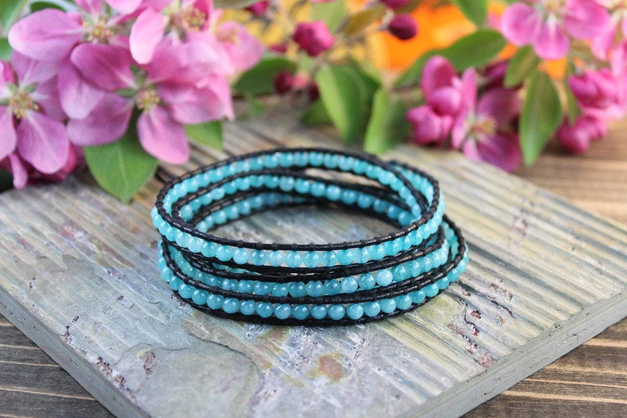 Blue ocean quartz (dyed) strung on black leather wrap bracelet with three loop closures for the perfect fit.