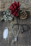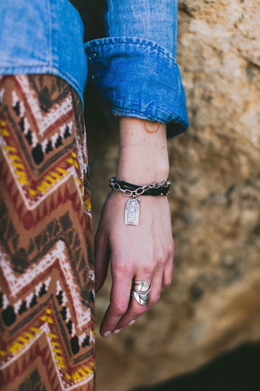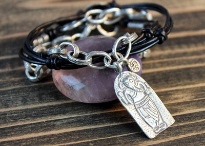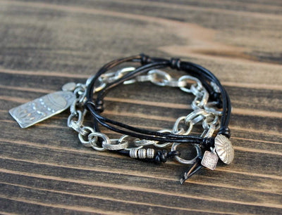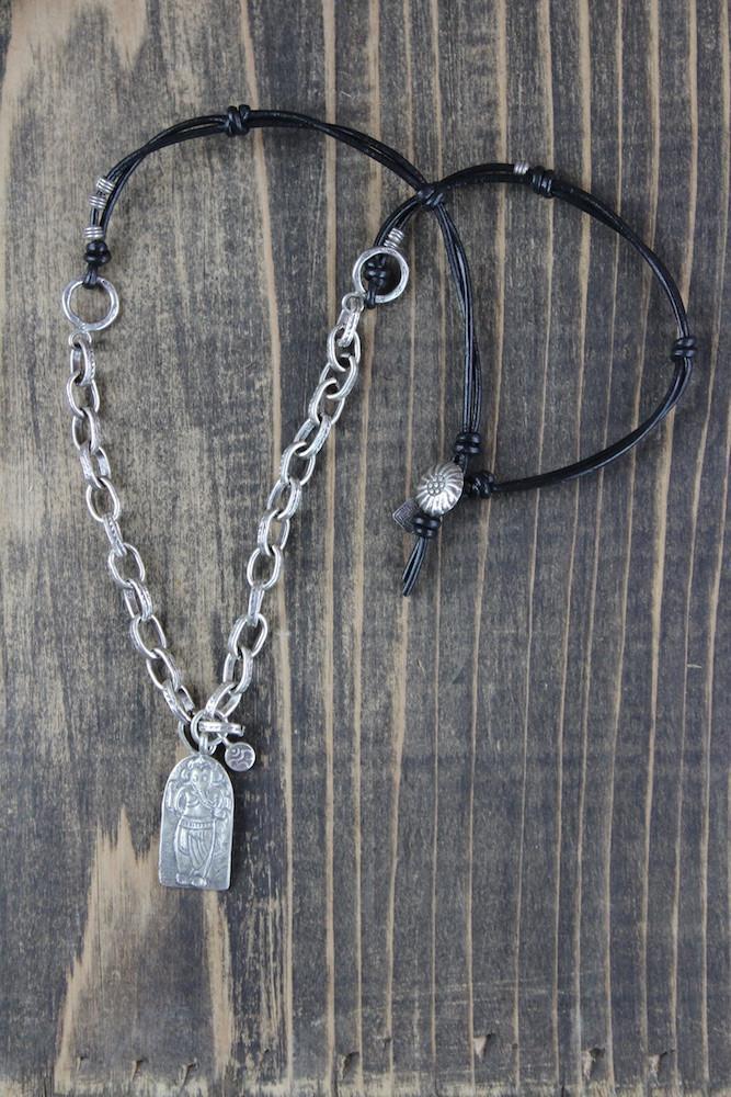 This could be worn as a necklace or bracelet; on a man or a woman! One of our most versitle items. Leather cord with Hill Tribe silver is attatched to pure Hill Tribe silver link chain with Om and Ganesh pendant. Eternal knot at end of necklace. 100% sourced and hand made in Thailand.
