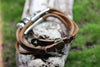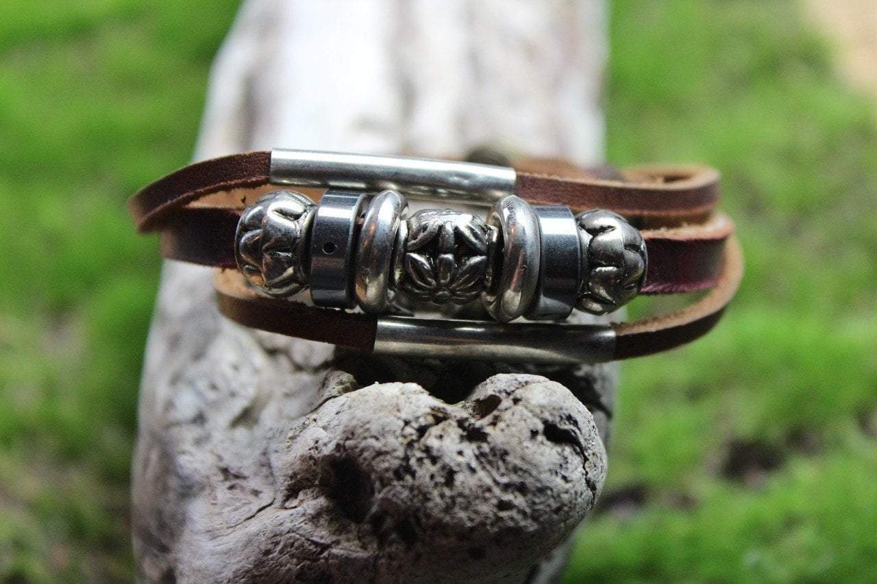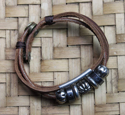 Handmade leather bracelet from India with white metal beads and a brass snap.