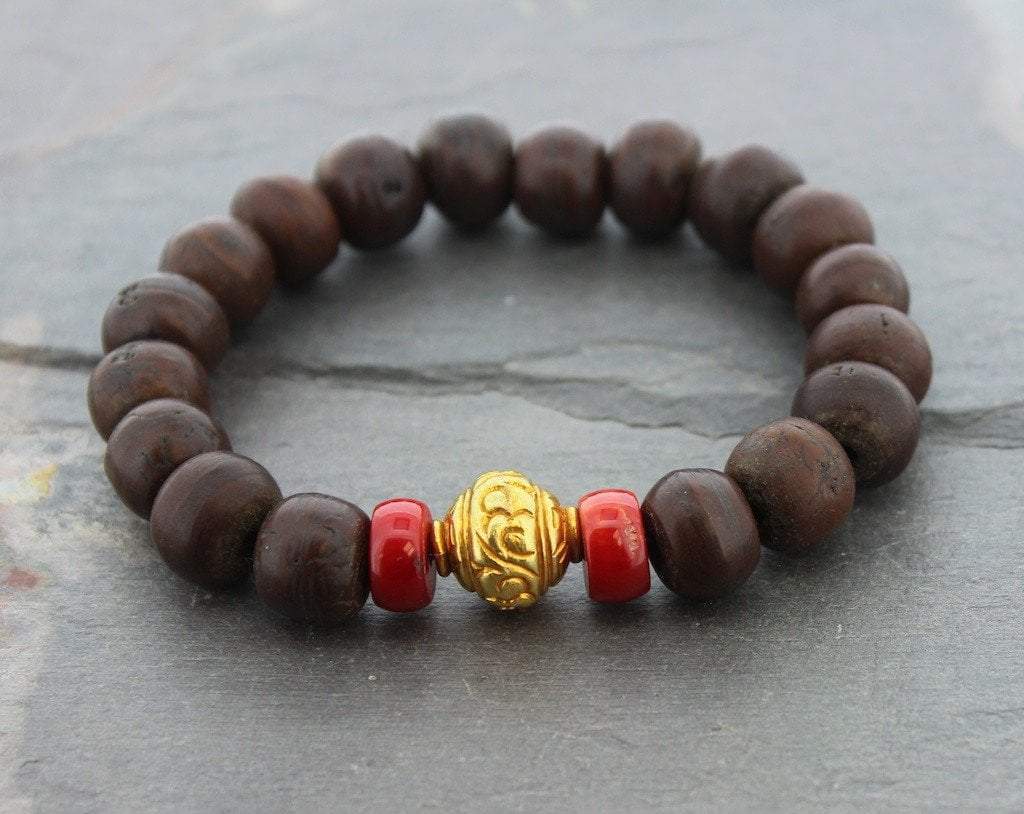A beautiful handmade Tibetan wrist mala with a gold vintage Tibetan spacer, 2 sherpa coral spacers (color enhanced white hearts) and old bodhi seeds from our collection.