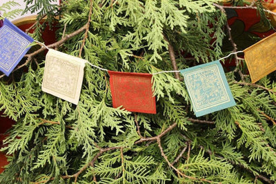 Great for adorning Christmas trees, hanging indoors or on a covered porch. these beautiful small paper flags are hand printed in Nepal. These handmade paper prayer flags are made from sustainable lokta paper in Kathmandu, Nepal.