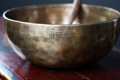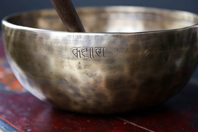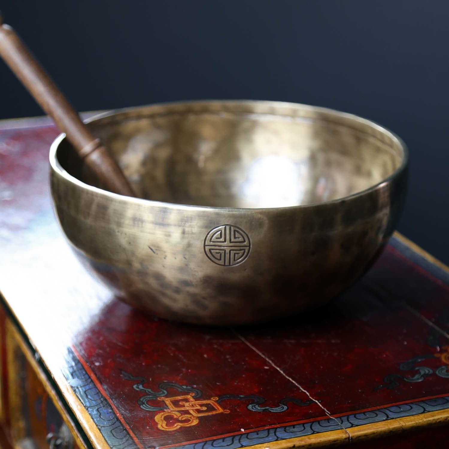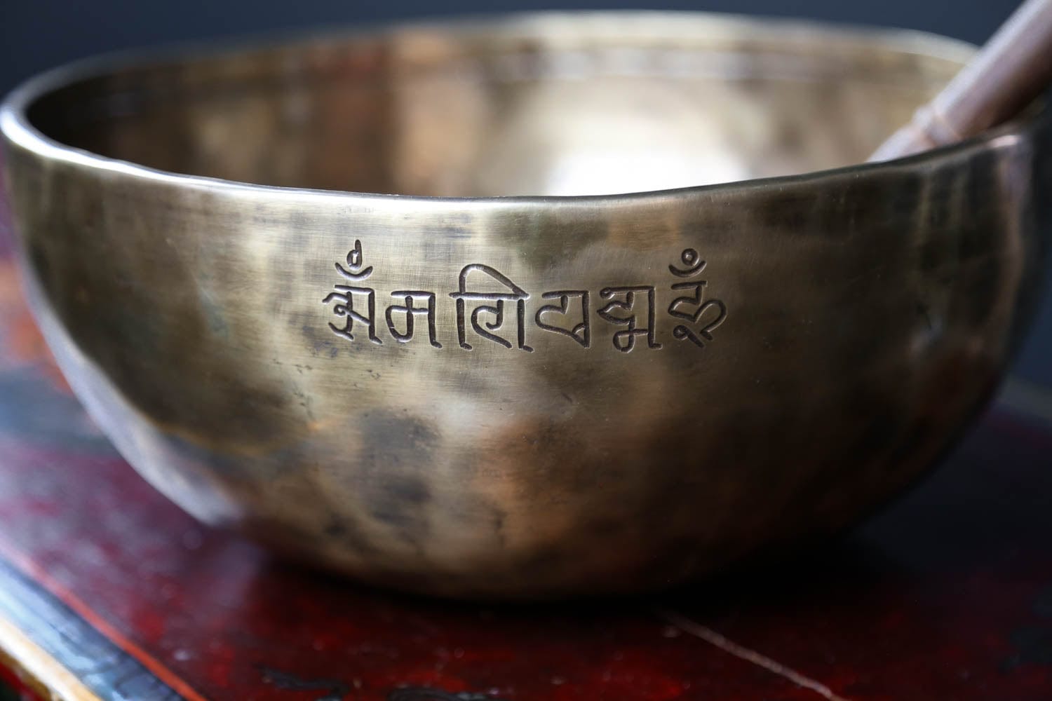 Each bowl features gorgeous hand carved details including an exclusive full moon singing bowl stamp, an original makers mark, and the mantra of compassion in Tibetan script.