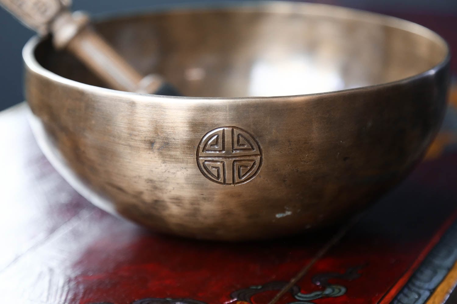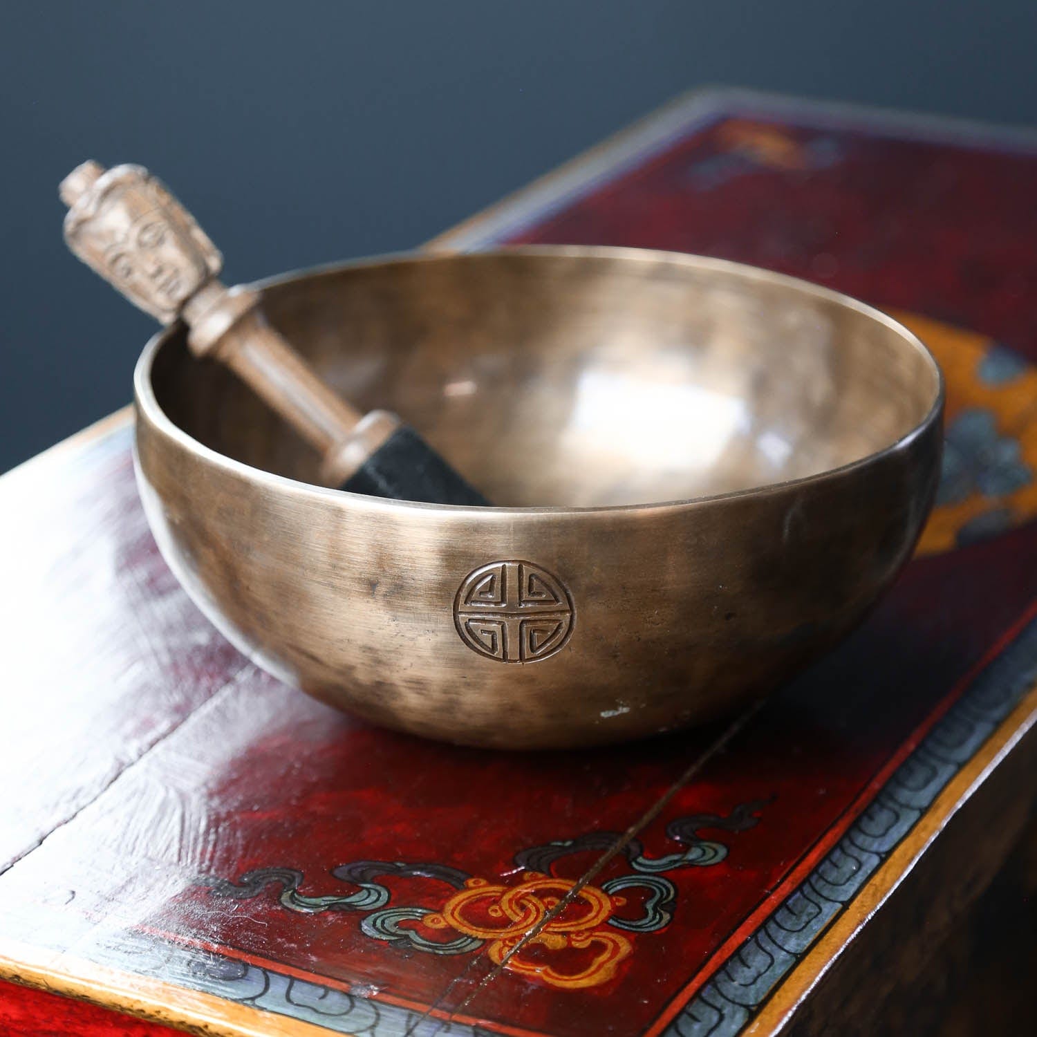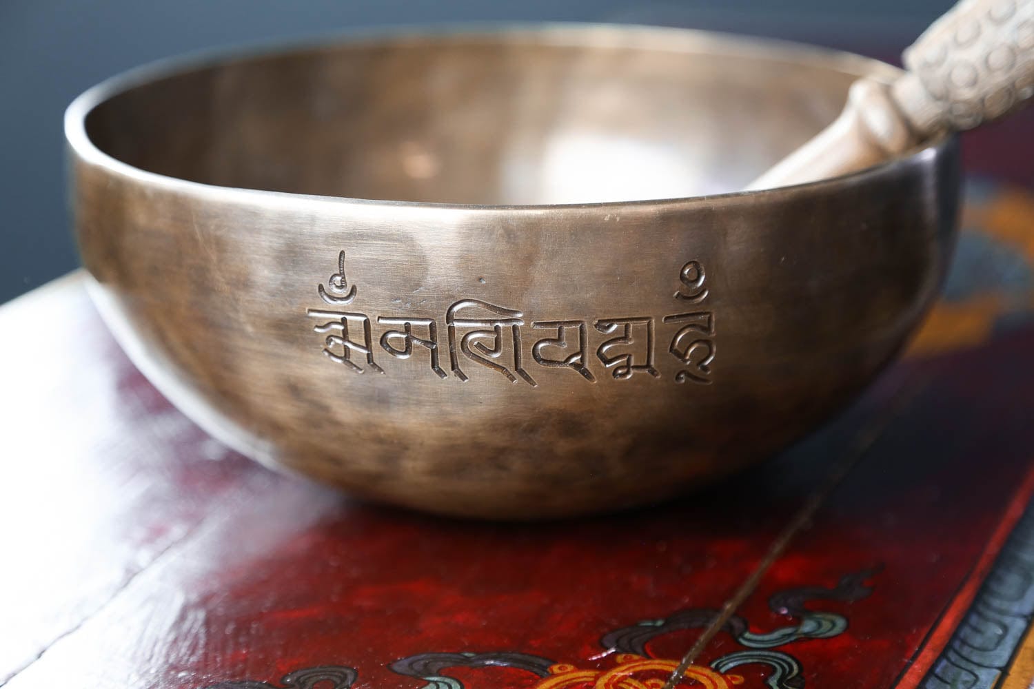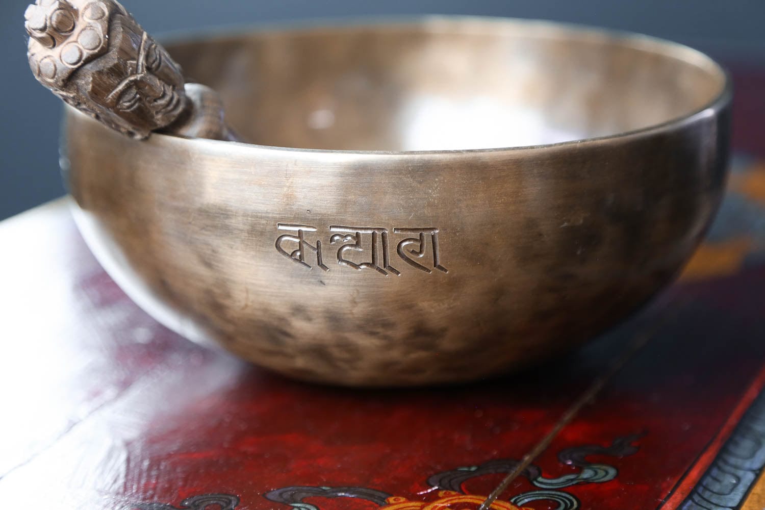 Each bowl features gorgeous hand carved details including an exclusive full moon singing bowl stamp, an original makers mark, and the mantra of compassion in Tibetan script.