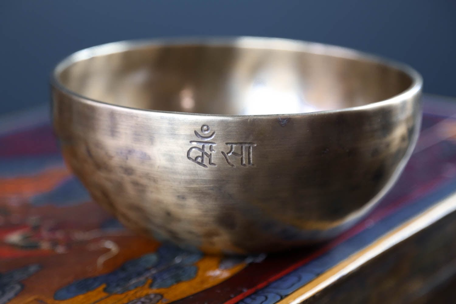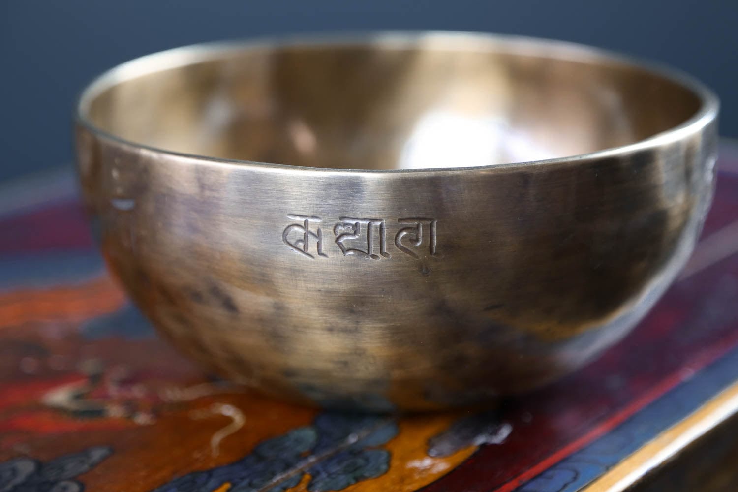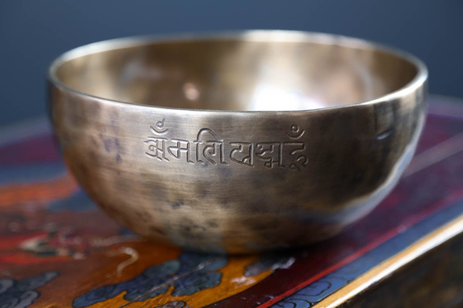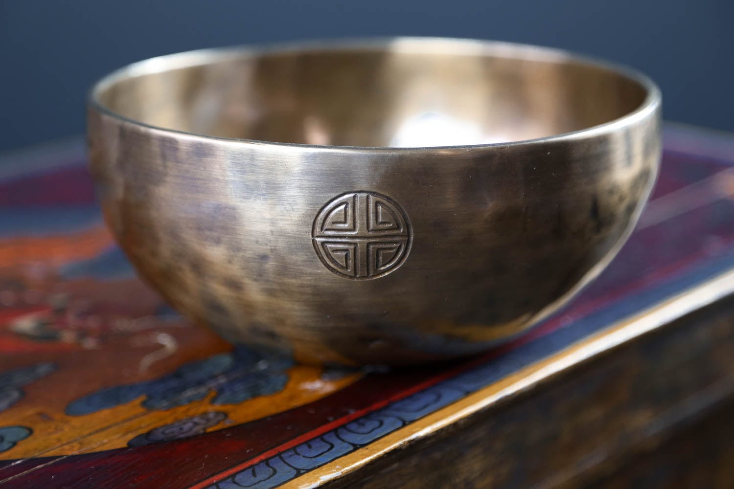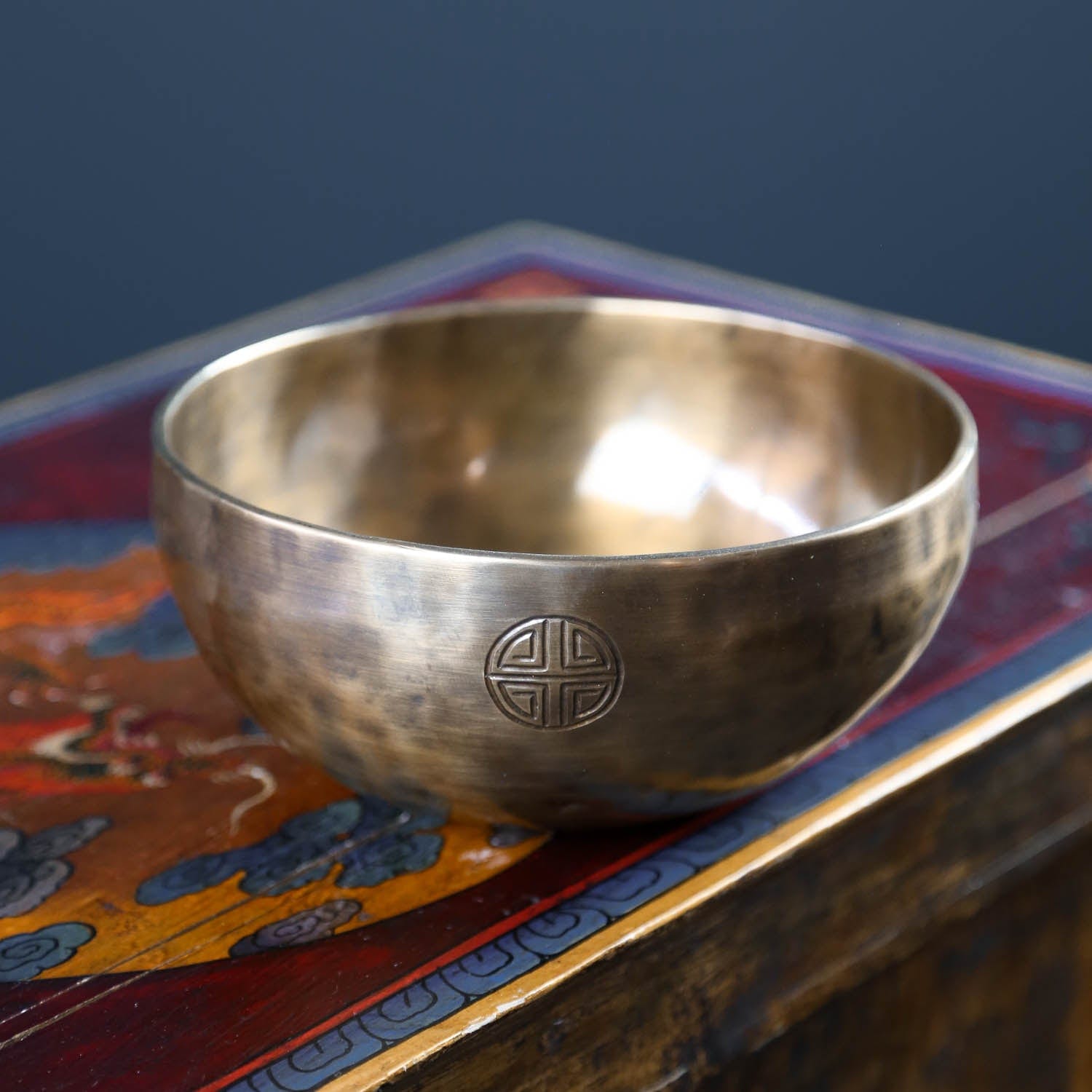 Each bowl features gorgeous hand carved details including an exclusive full moon singing bowl stamp, an original makers mark,  and the mantra of compassion in Tibetan script.  The mantra invokes the powerful benevolent attention and blessings of Chenrezig, the embodiment of compassion.  The full moon singing bowl stamp is also known as the symbol of longevity and happiness.