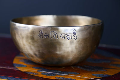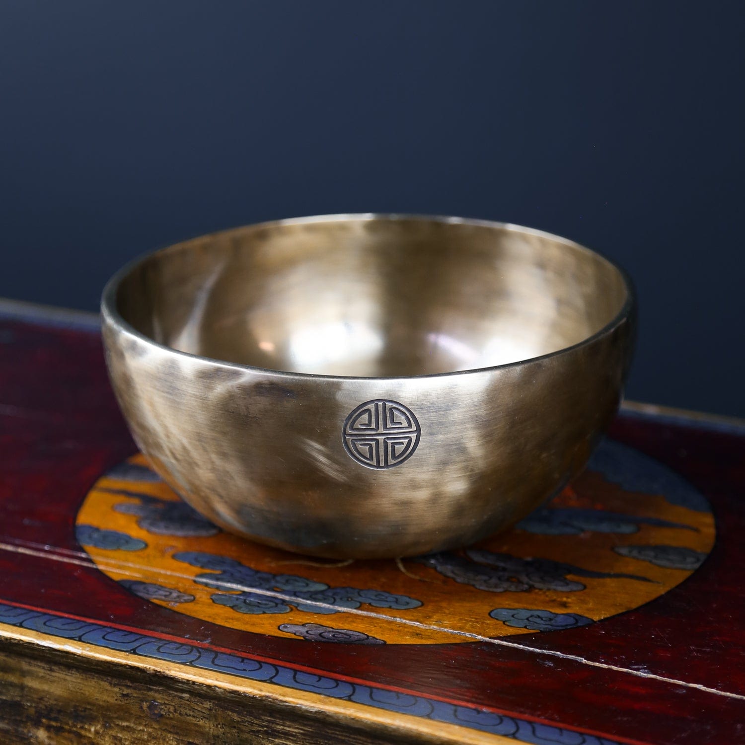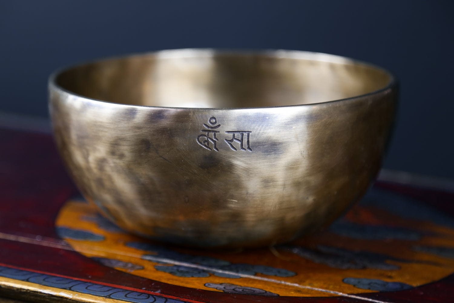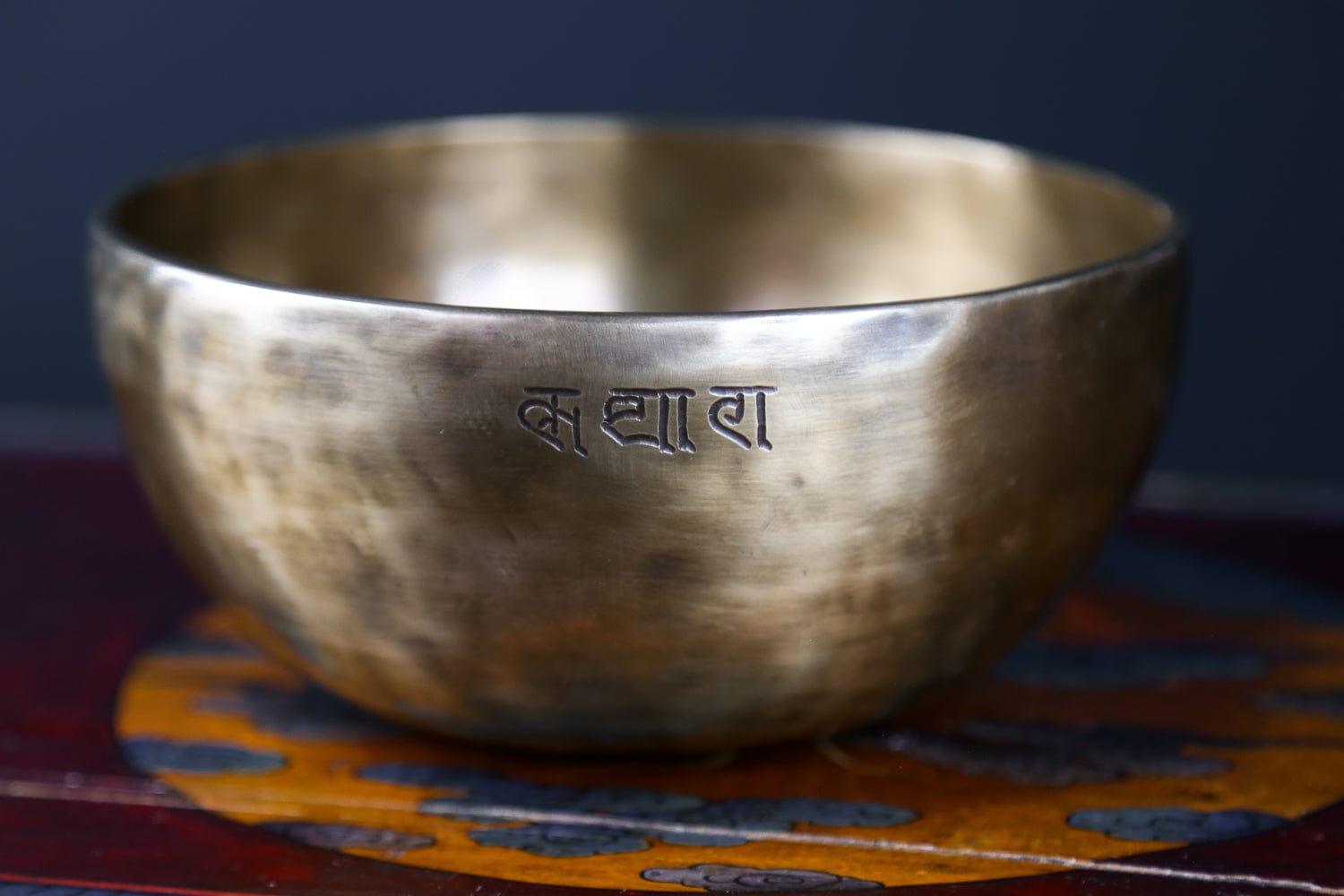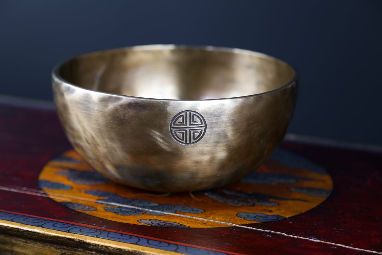 Each bowl features gorgeous hand carved details including an exclusive full moon singing bowl stamp, an original makers mark, and the mantra of compassion in Tibetan script.