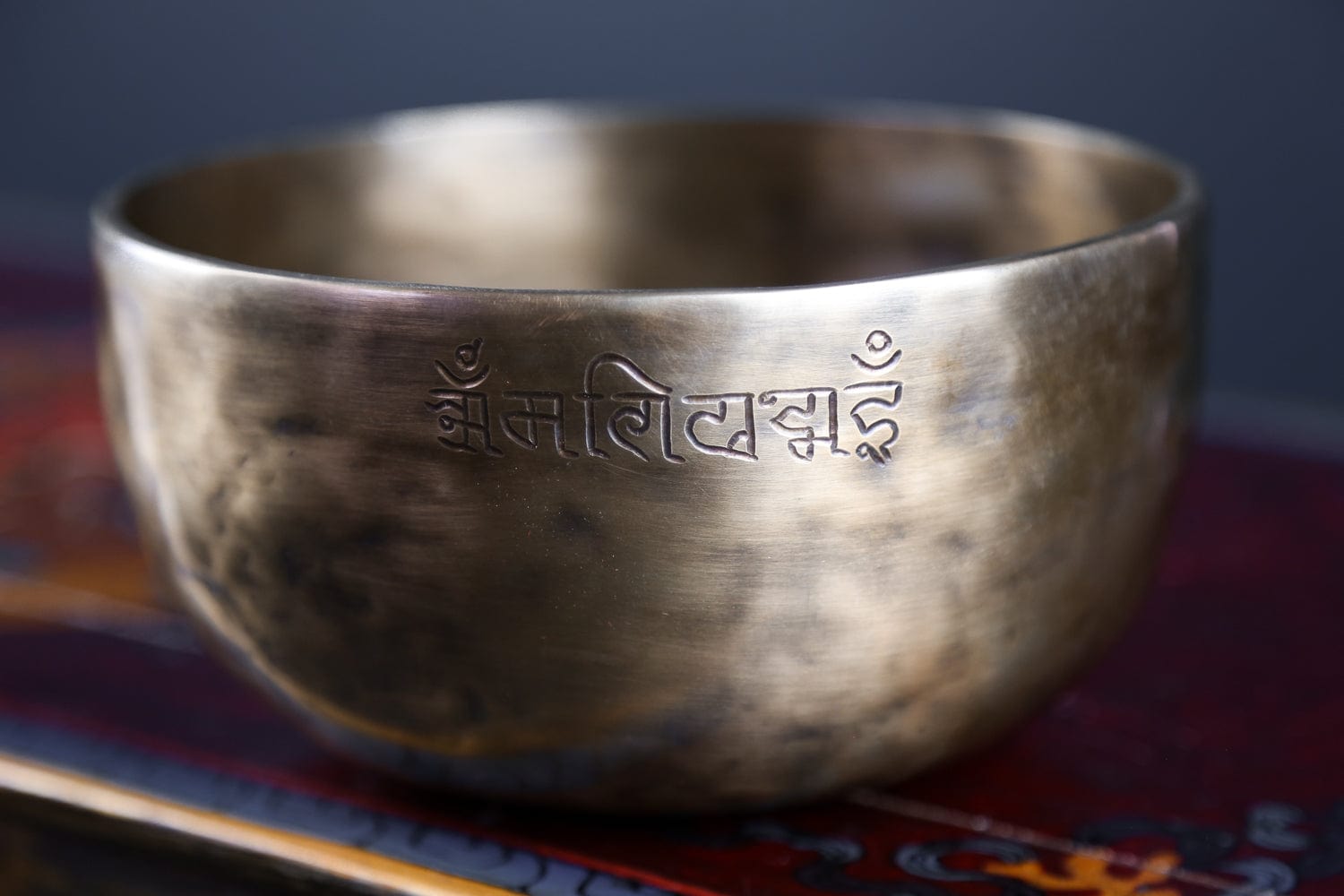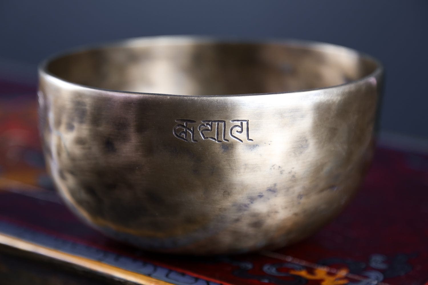 Each bowl features gorgeous hand carved details including an exclusive full moon singing bowl stamp, an original makers mark, and the mantra of compassion in Tibetan script.