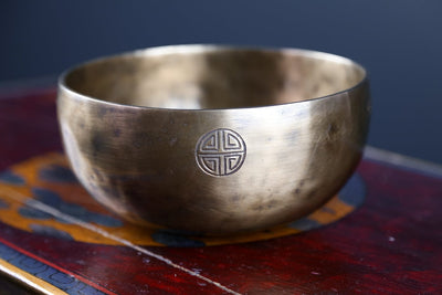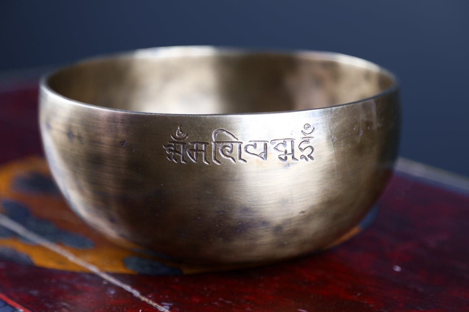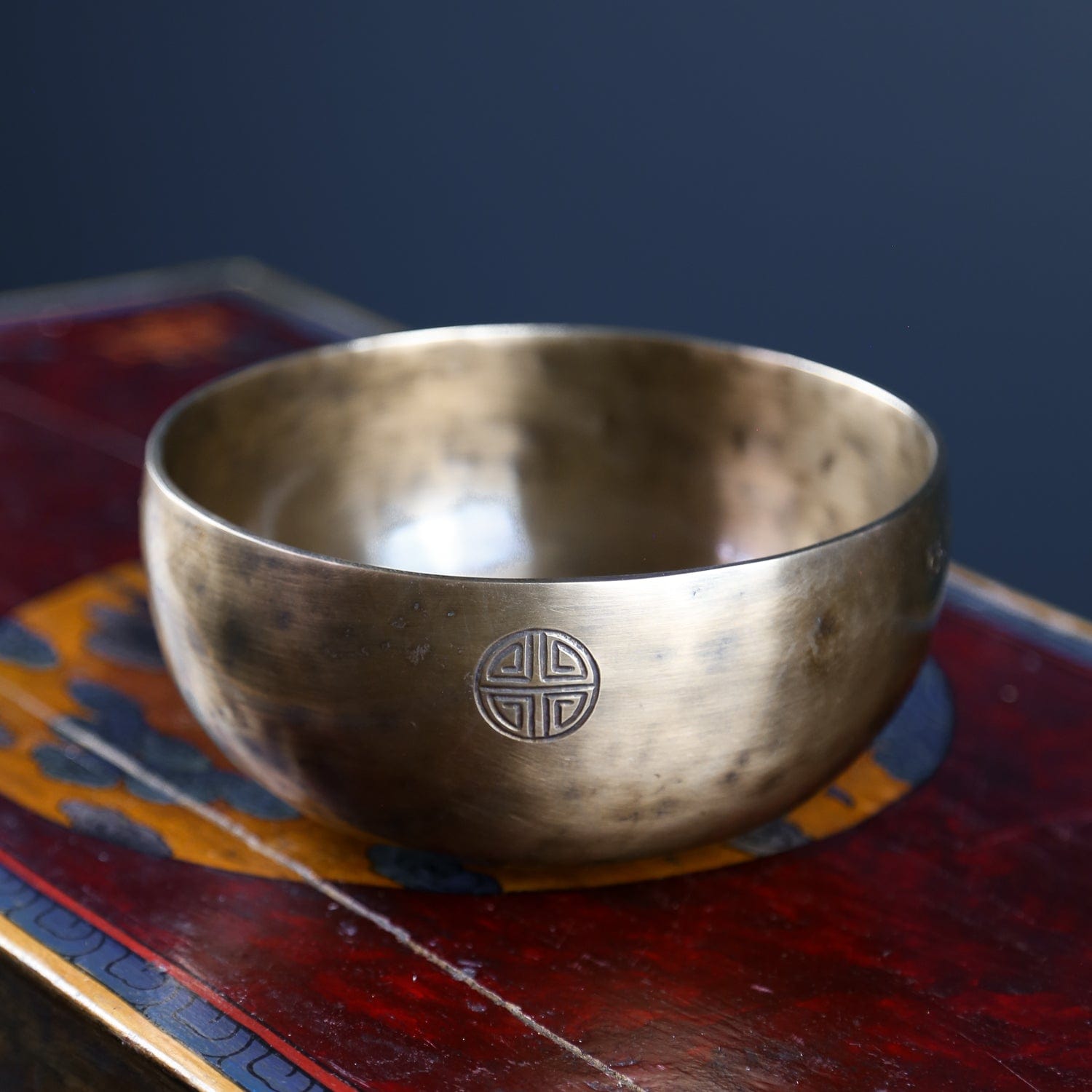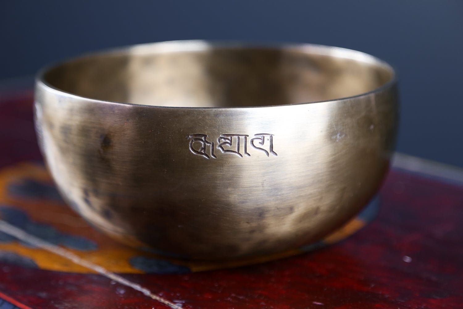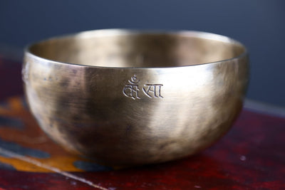 Each bowl features gorgeous hand carved details including an exclusive full moon singing bowl stamp, an original makers mark, and the mantra of compassion in Tibetan script.