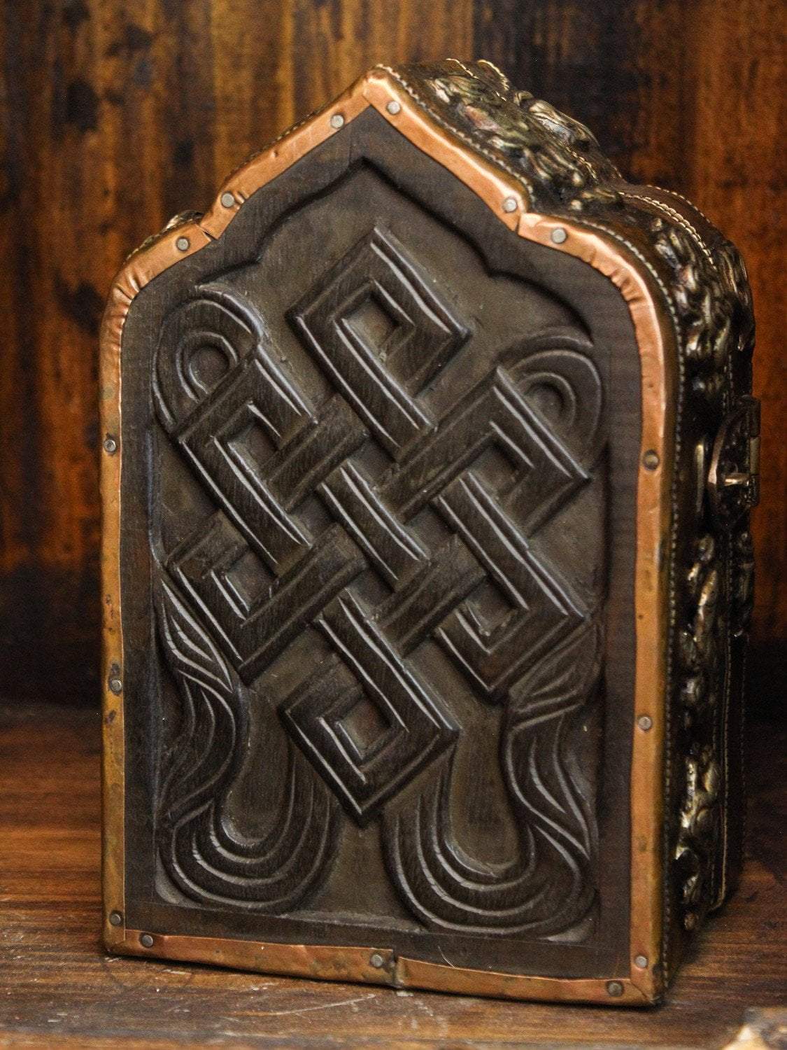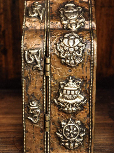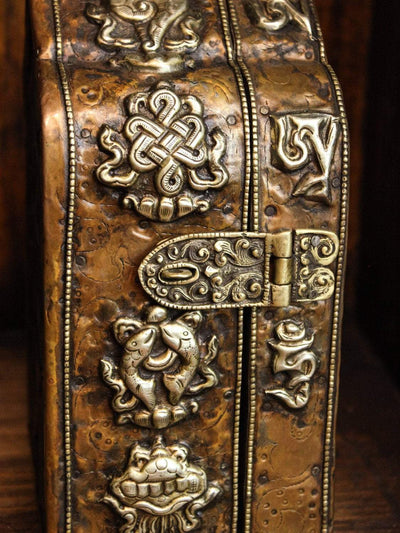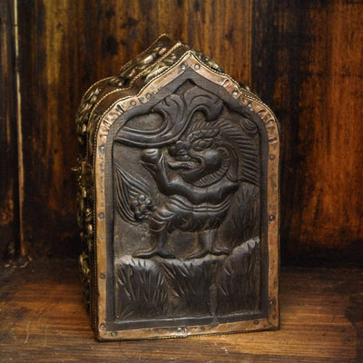 There is only one man in Nepal that makes these amazing bell and dorjes with hand carved cases. We only received 1 of these this year. Set includes a 7 metal bell with a clear tone and exquisite carving, and a 4 pronged dorje with amazing detail. The hand carved wood case is simply stunning. The case is set in gorgeous brass and copper with an image of Garuda on one side and an Endless Knot on the other. The Eight Auspicious Symbols are featured along the sides of the box.