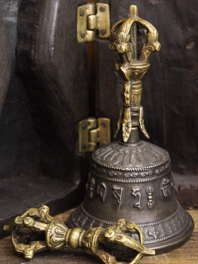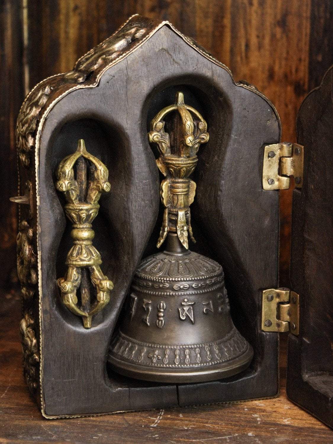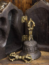Box is approximately 9 inches tall, 6 inches wide, and 4 inches deep. The bell measures about 6 inches tall and the dorje is about 4 inches. Handmade in Kathmandu, Nepal.