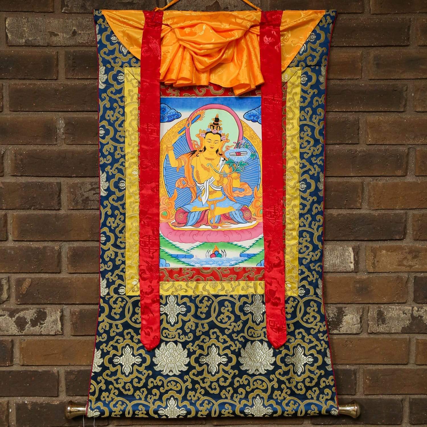 The traditional Tibetan brocade fabric is a polyester and silk blend, making it a long-lasting and versatile material. The deep blue brocade features intricate golden dragon designs with red and yellow framing around the painting.