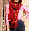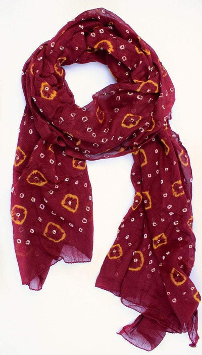 This beautiful batik maroon scarf is versatile and gorgeous. Great for spring or fall accessorizing! Gauzy sheer material with batik print and hand dyed with vegetable dyes. Hemmed on the ends to prevent unraveling.