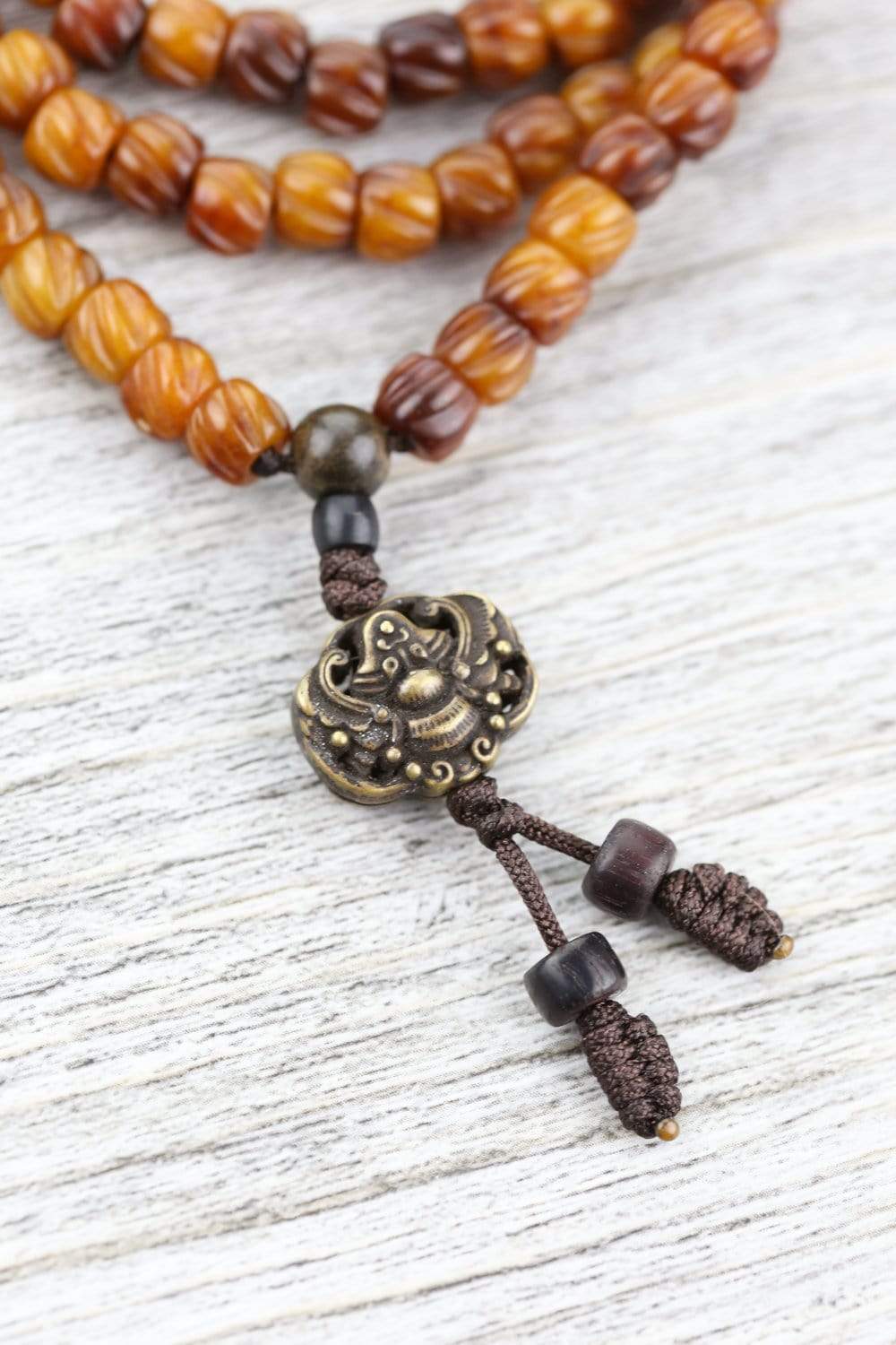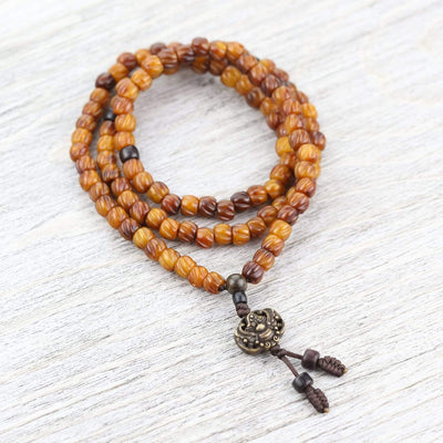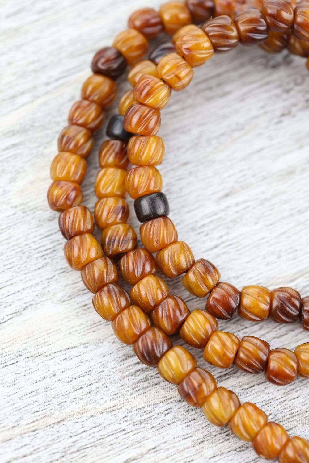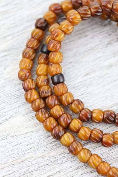 • The one-of-a-kind mala features 108 hand carved antique bone beads with 3 dark bone spacers on brown cord.  Bone beads are often recognized as a symbol if impermanence and serve as a reminder to live in the present moment.