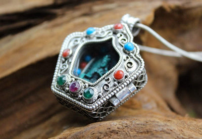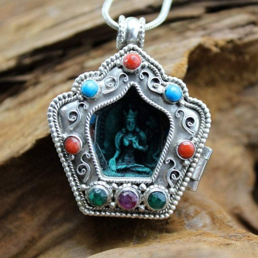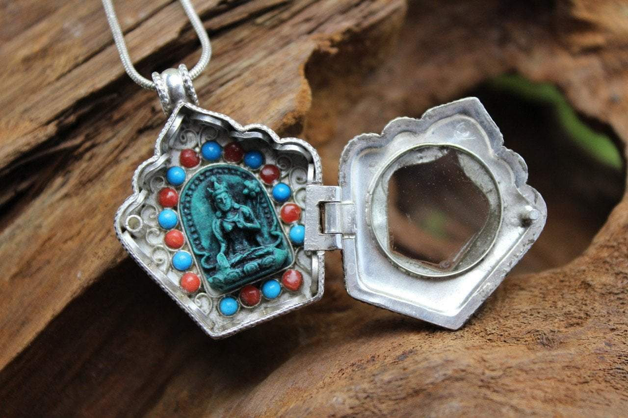 Sterling silver gau box pendant with White Tara inside. Glass cover with hinge.