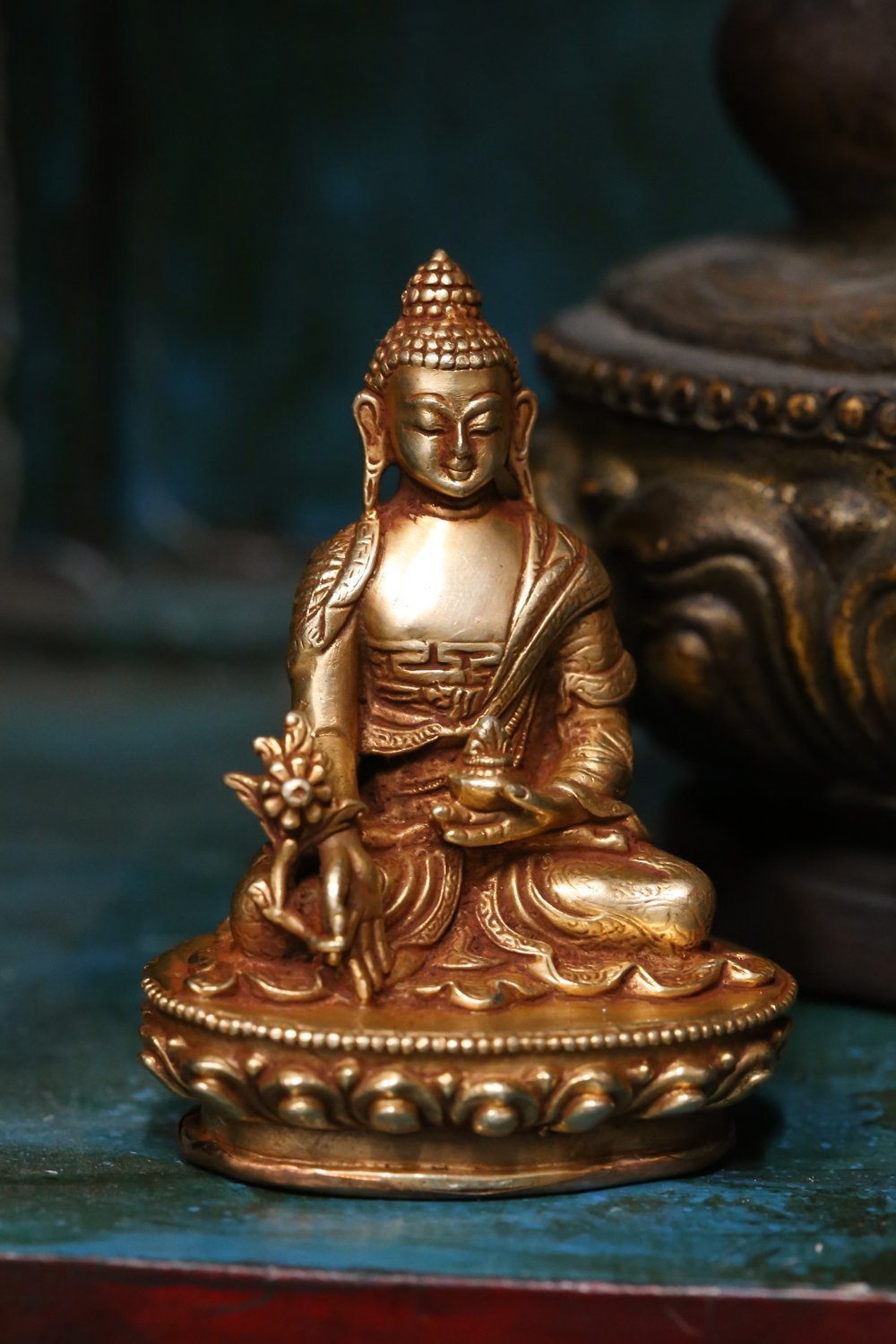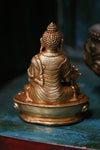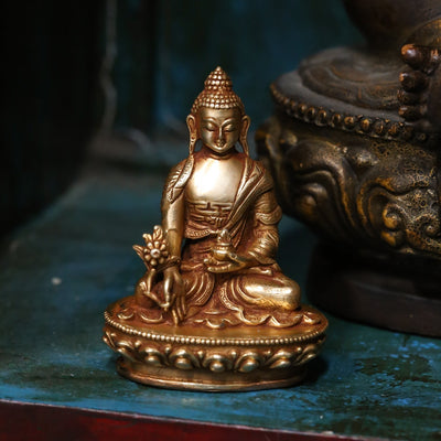 This small Medicine Buddha statue is handmade by master sculptors in Nepal. The hand sculpted molds are first cast using bronze before being entirely 14K gold plated. The detail is truly amazing on these small statues! It is the perfect size for your altar, bookcase, or desk. The bottom of the statue is hollow for consecration.