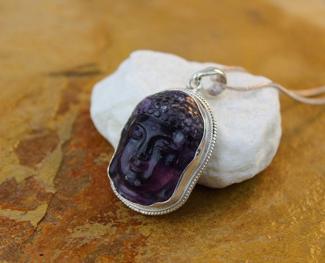 Amethyst is the stone of the crown chakra. Opening your crown chakra can open your center for wisdom. Elegant banded amethyst carved Buddha head with serene meditative expression is set in sterling silver with sterling bail.