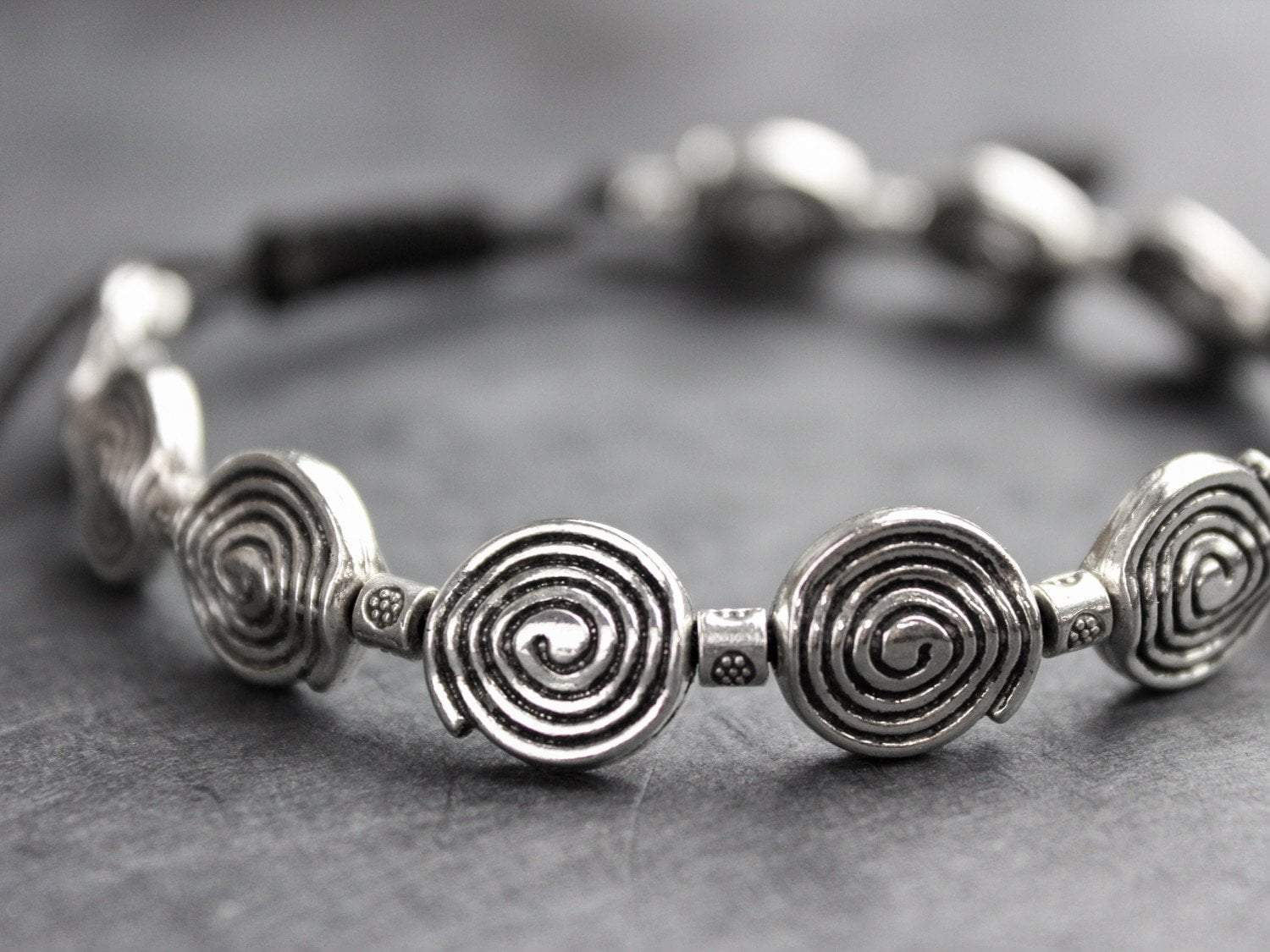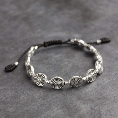 • Made in Nepal, it features bold and stylish silver-plated spiral beads strung on black cord.