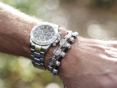 • Our adjustable men's bracelet looks great on it's own or with a stack of your favorite bracelets, wrist malas, and even a watch.