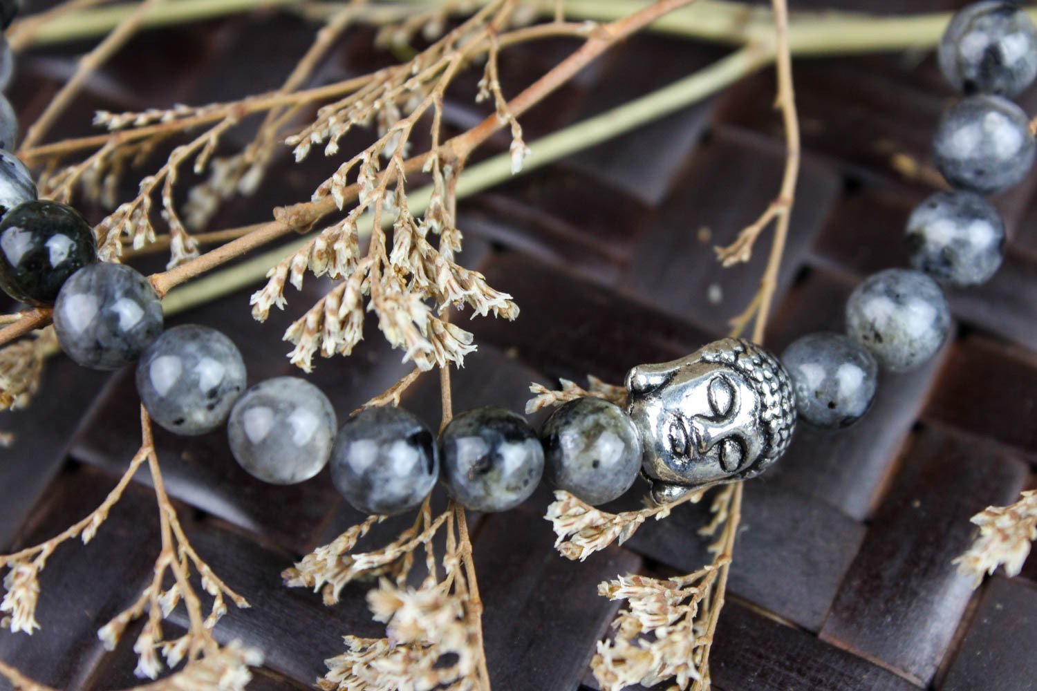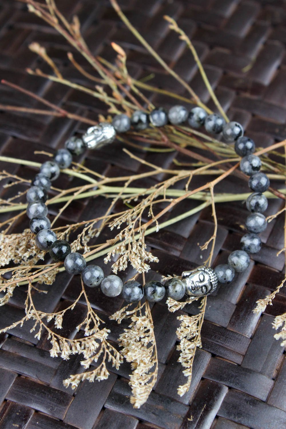 Great men's bracelet that features black labradorite beads with two silver Buddha head beads at either end of the bracelet.