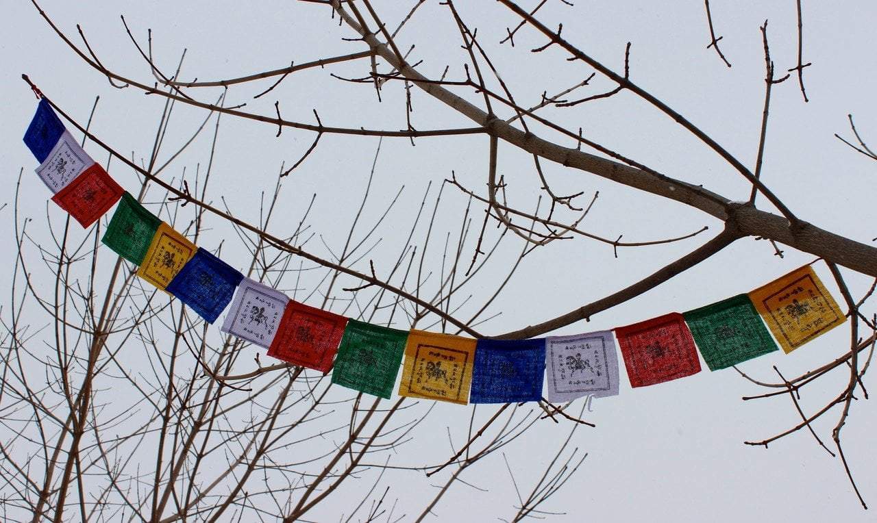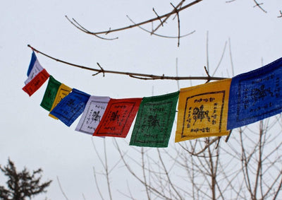 Made in Kathmandu, Nepal. 100% cotton on a polyester cord. Traditional flags with central image of a Windhorse.