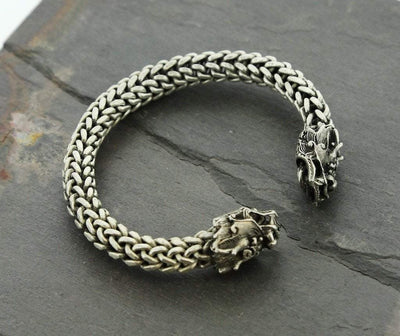 Sourced in kathmandiu Nepal from a large collection of modern pieces. The dragon heads are sterling silver. The bracelet is a pliable pewter which adjusts to fit any wrist