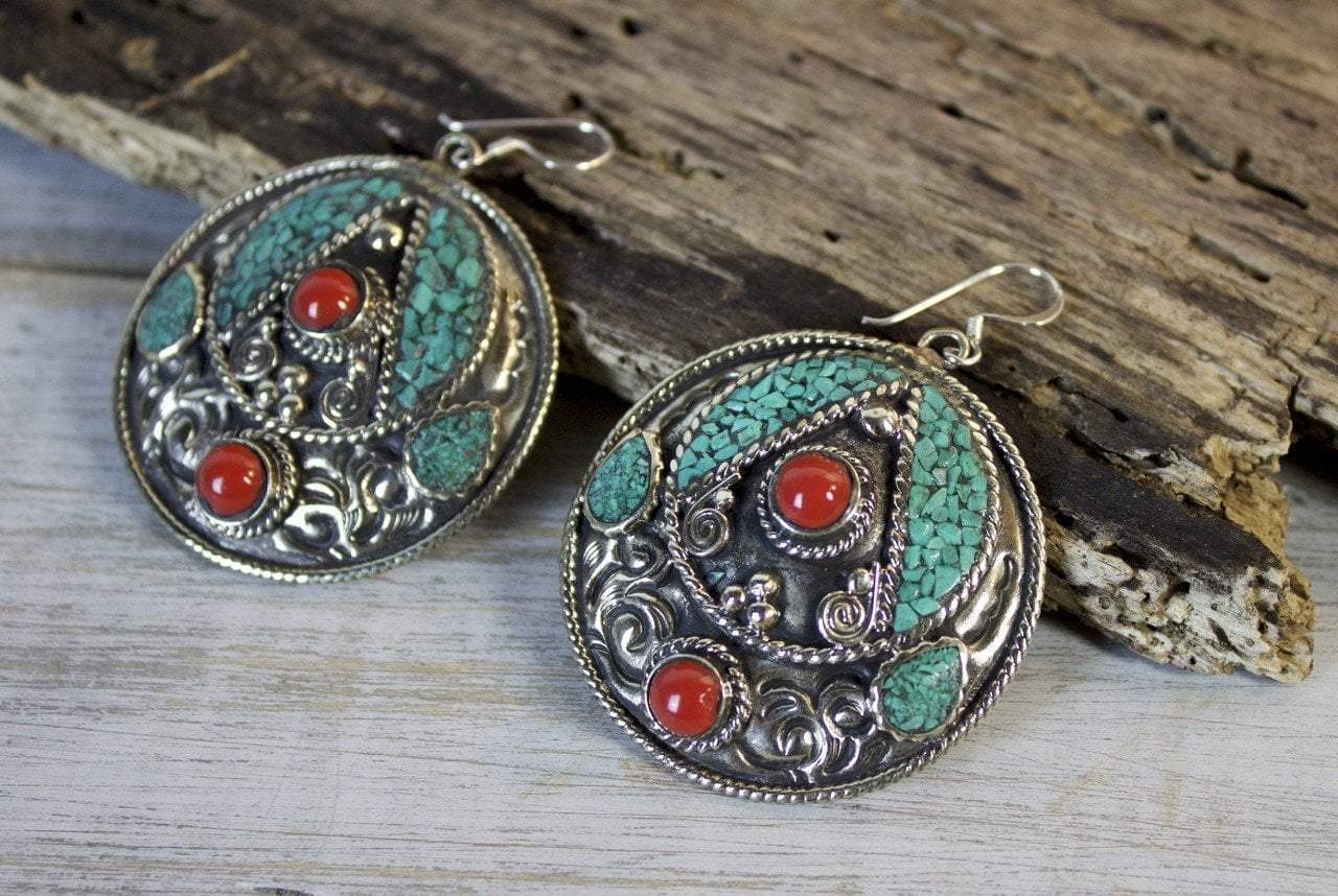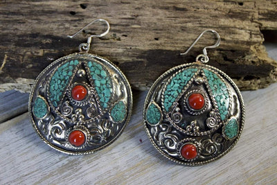Hand-inlaid mosaic turquoise and coral stones on silver plated earrings. Sterling silver french hooks. Hand made in Nepal. Size:approximately 1 1/2 inches tall.