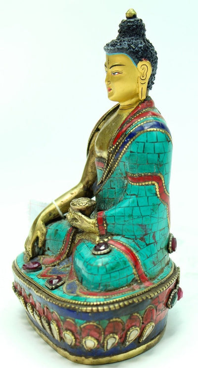 This Shakyamuni statue is handmade in Kathmandu, Nepal by a 5th generation crafting family.  Each statue is made using the lost wax method, which takes considerable time and skill.  After bronze casting each statue is hand detailed and carved by master craftsmen.  The face is gold painted and the robes are hand tiled and jeweled.