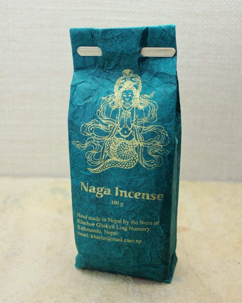 This Naga incense represents the serpent dieties which have excessive strength, offer protection, and guard against harmful energies.  Handmade by the nuns of Khachoe Ghakyil Ling Nunnery in Kathmandu, Nepal.