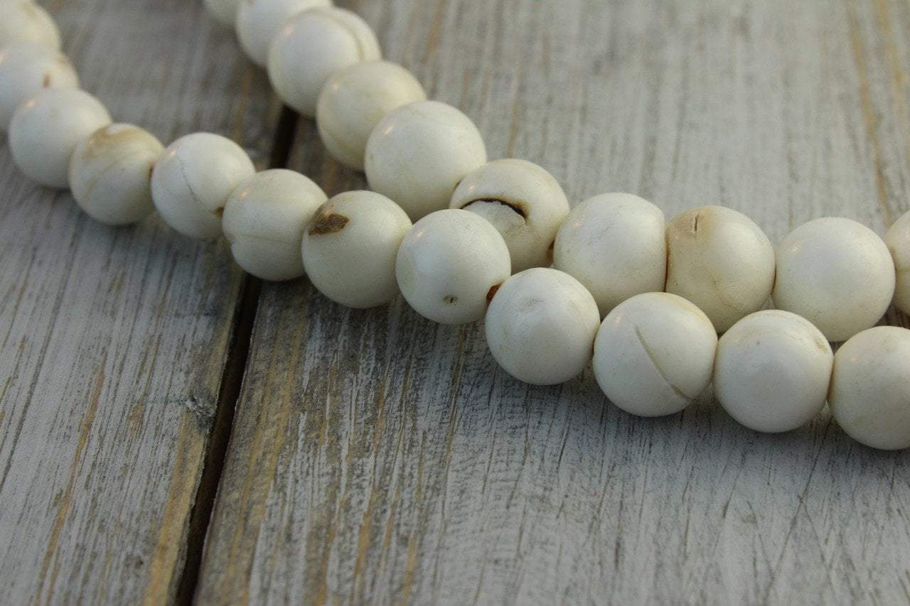 The perfect summer necklace for anyone! There are many styles and sized of naga shell beads available in Kathmandu. These very special shell beads are hand carved in Nepal and are a rare, small size. The beads are strung on a golden, hand knotted cord.