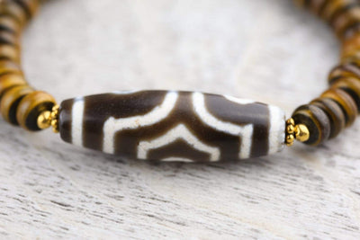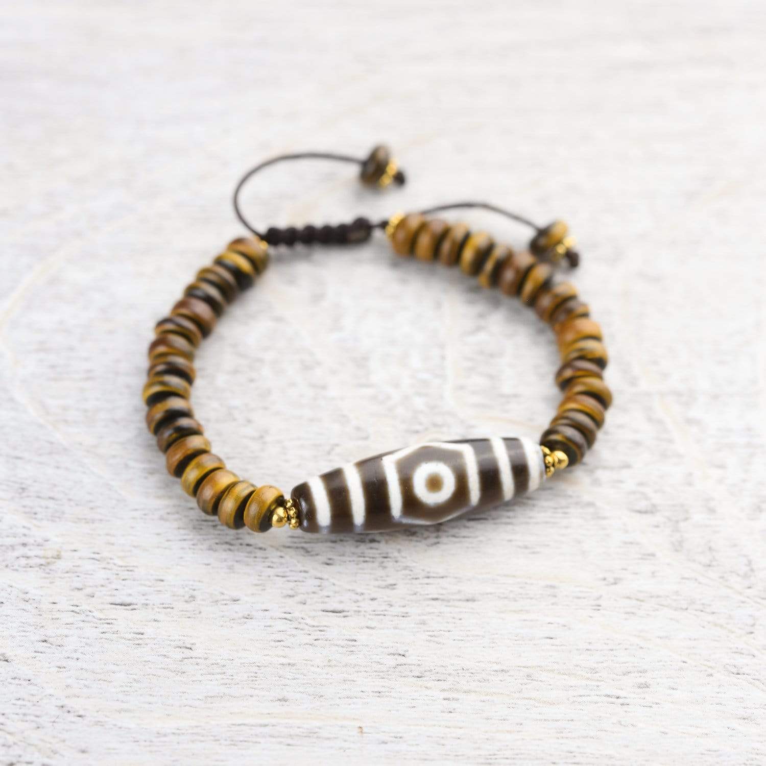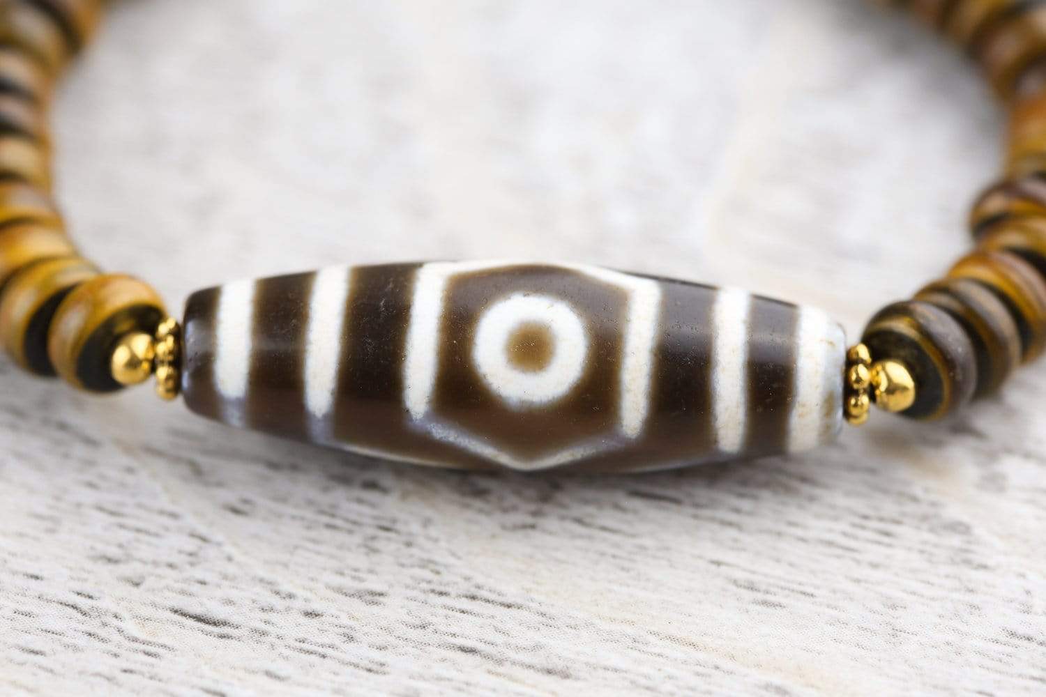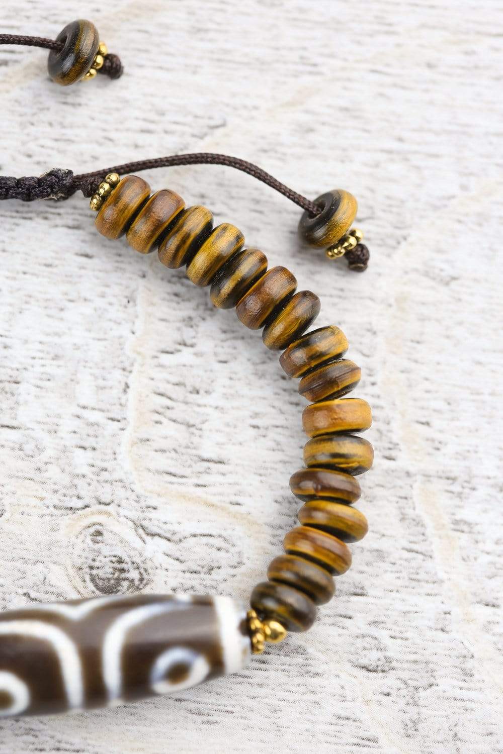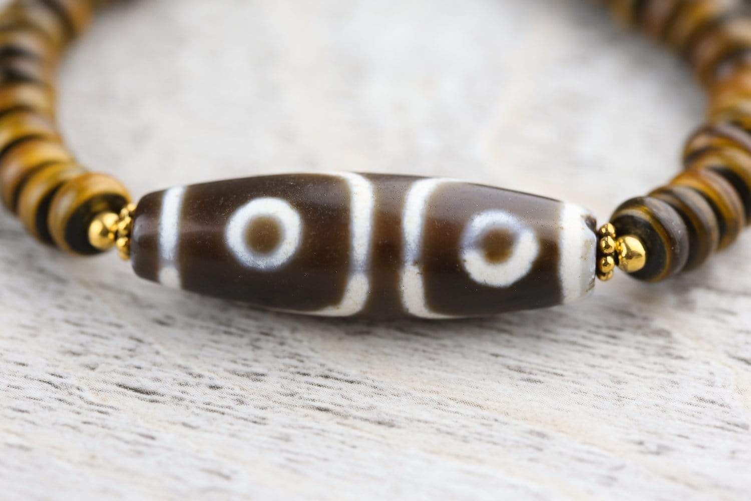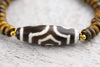Adjustable wrist mala measures approximately 6.75 inches around when fully tightened and opens to about 9 inches. Beads are 8mm. Dzi bead is 1.5 inch long and 0.5 inch wide.