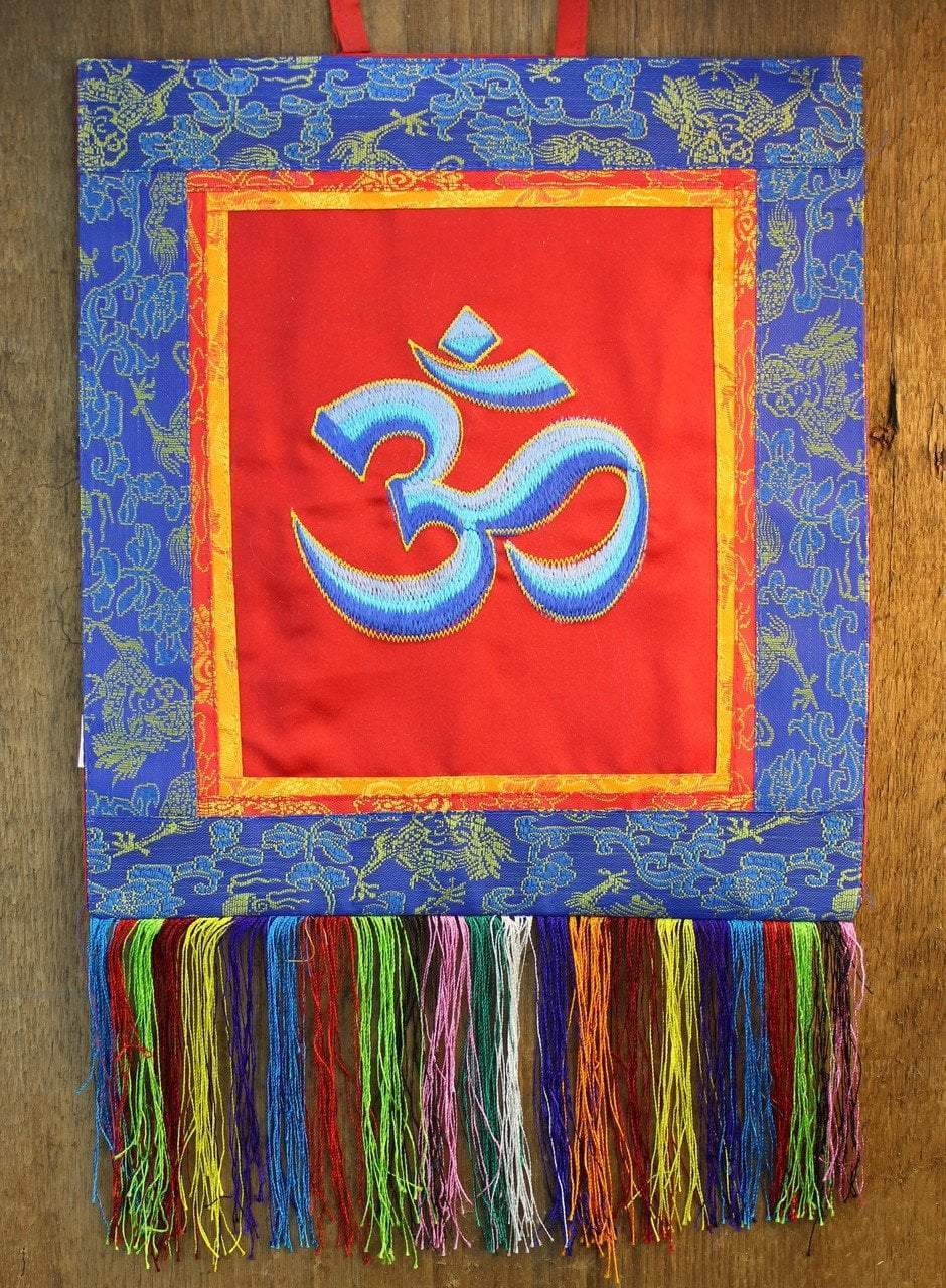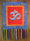 Large Embroidered Sanskrit 'Om' symbol. Made in Nepal. Red background with blue OM.