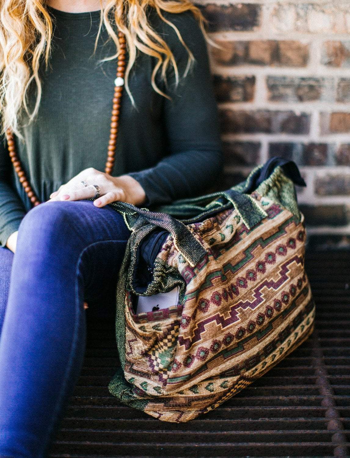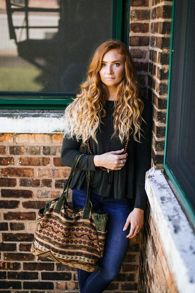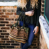 This handcrafted tote bag has a vintage inspired design that is fitting for an old soul. The size and features are excellent for carrying just about anything including your books, laptop, yoga gear, or day to day items. It includes two outside pockets to fit essentials like your water bottle or phone, and an inside pocket with zipper for smaller items. Made of handwoven cotton in Nepal, this bag features a vintage Southwestern style design on the front and a solid yellow and black woven cotton back.