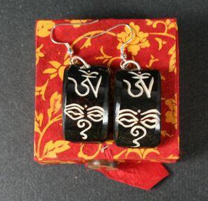 These natural tree resin earrings are hand formed and carved. They come in an all natural Lokta paper gift box.Size:1 inch tall rounded shape