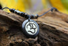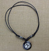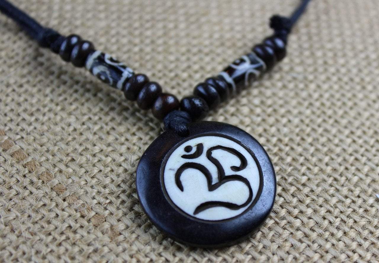 Classic necklace accented with dzi beads and featuring a hand carved bone Om pendant.