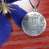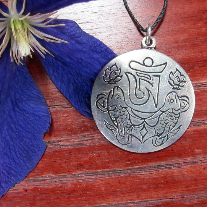 Tibetan Om combined with the auspiscious fish symbol on a flat, round silver pendant.Size:1 1/2 in.