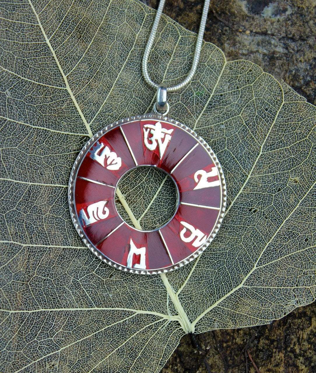 Om Mani Padme Hung hand set lettering with coral inlays.