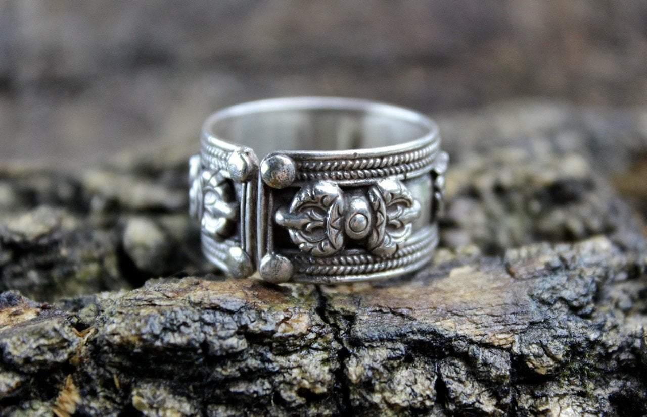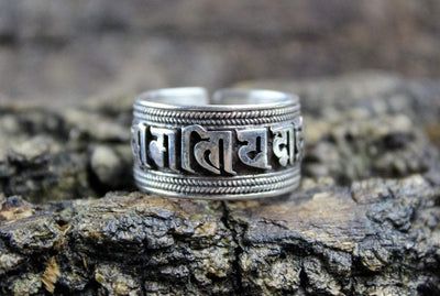 Om Mani Padme Hum sterling silver adjustable ring. Script is traditional Newari. Made in Nepal.
