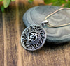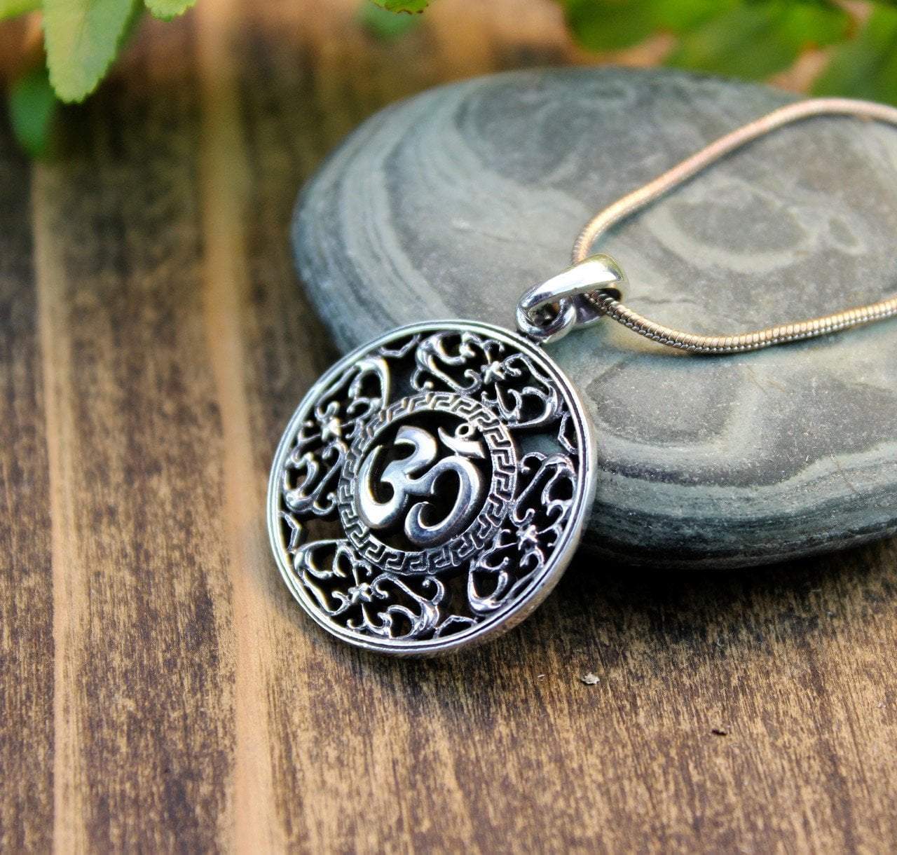 Sterling silver Om pendant with intricate hand carved design. Made in Nepal.