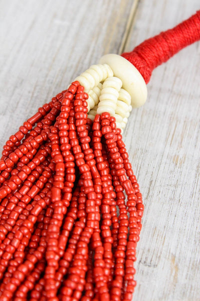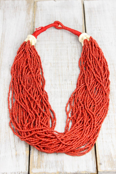 This one of a kind coral beaded necklace was hand made in the city of Kathmandu, Nepal. 40 strands of hand strung beads are held togehter with white bone beads.