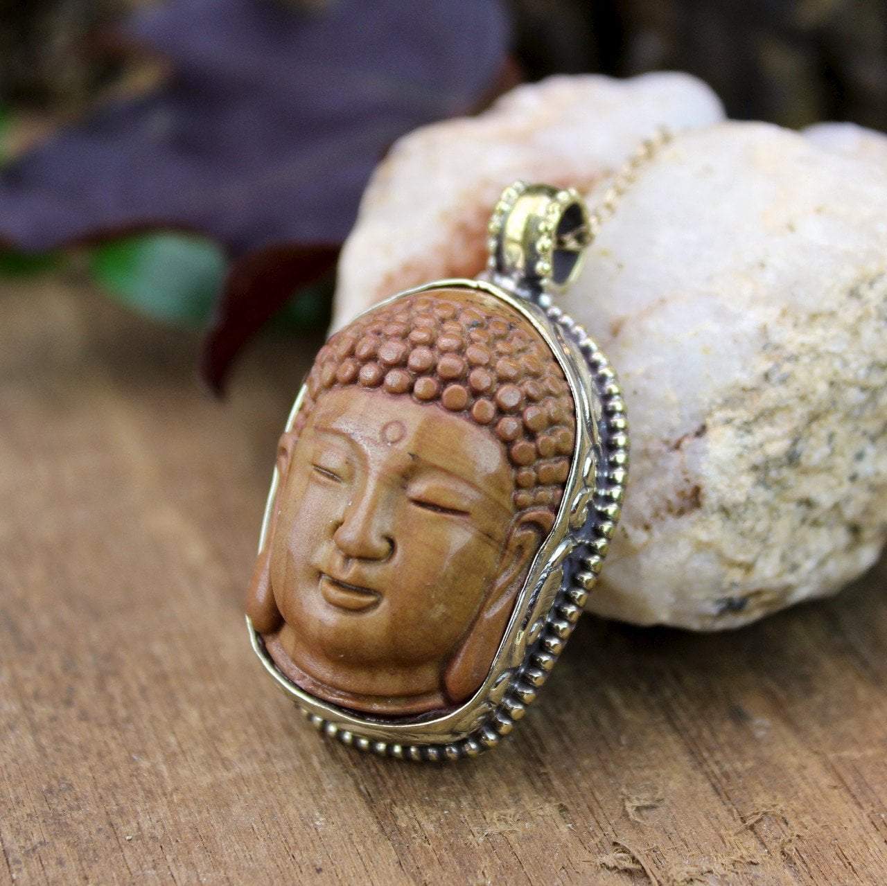 One of a kind pendant made out of tiger eye stone. Elegant cast Buddha head with serene meditative expression is set in sterling silver with sterling bail. Hand rope-work decorates the sides of setting. Handmade in Nepal.