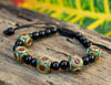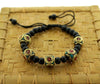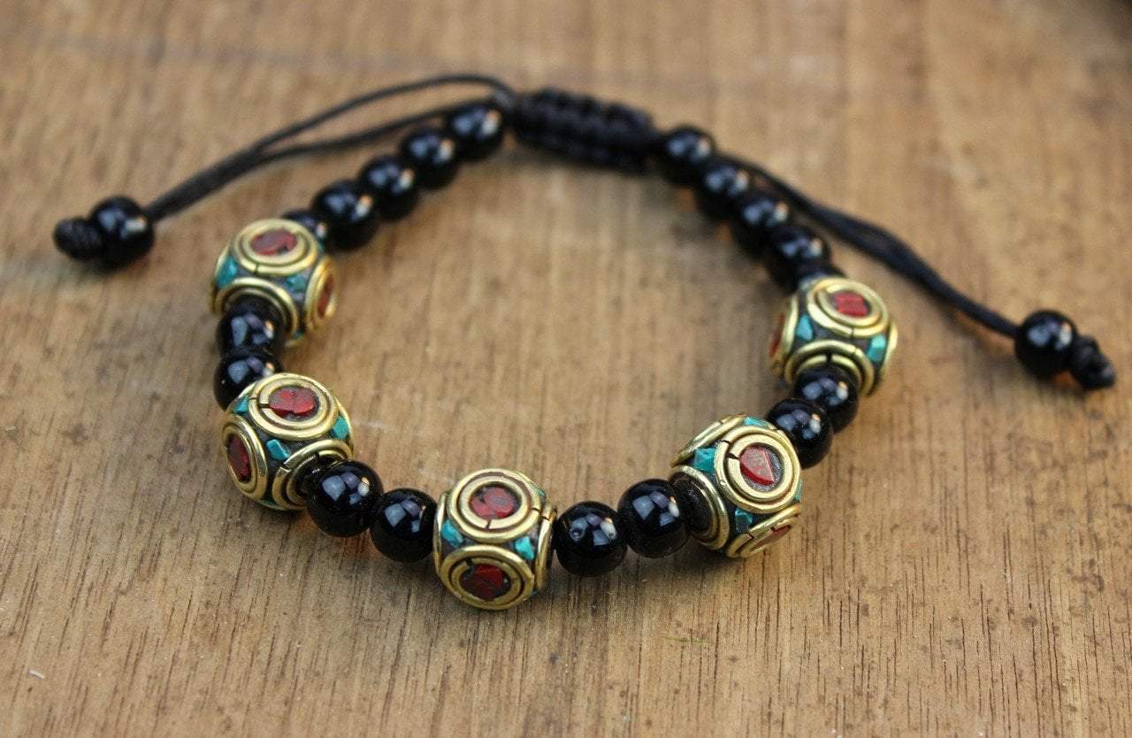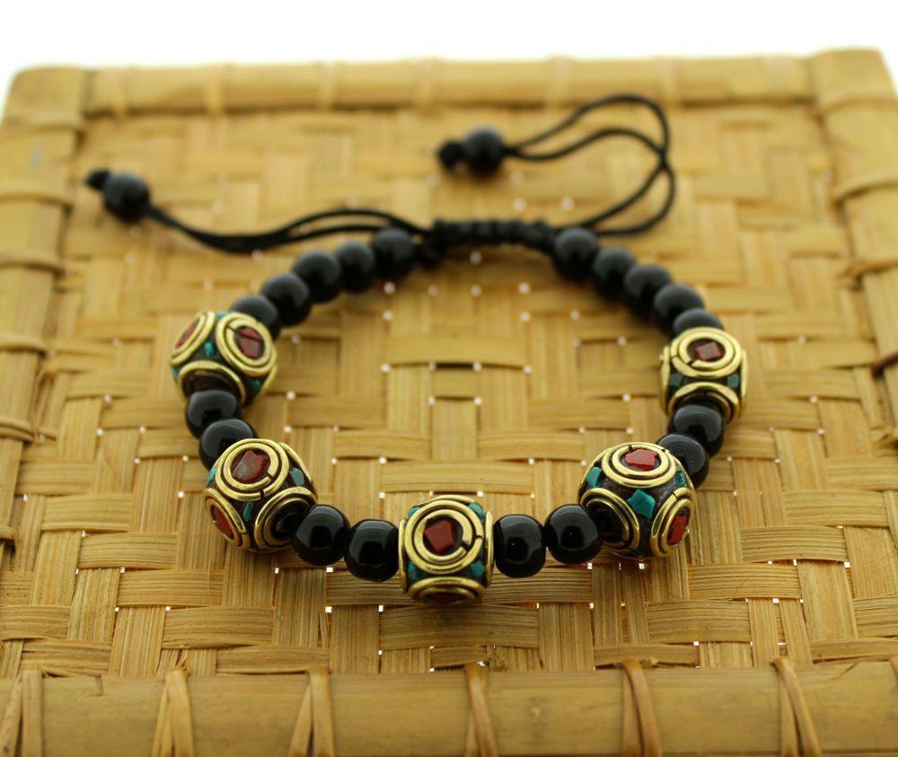 Adjustable wrist mala strung on black cord, it can fit wrists from 5 to 8 inches around. Contains 6mm onyx beads and 10mm Tibetan beads. Handmade right here in the DharmaShop!