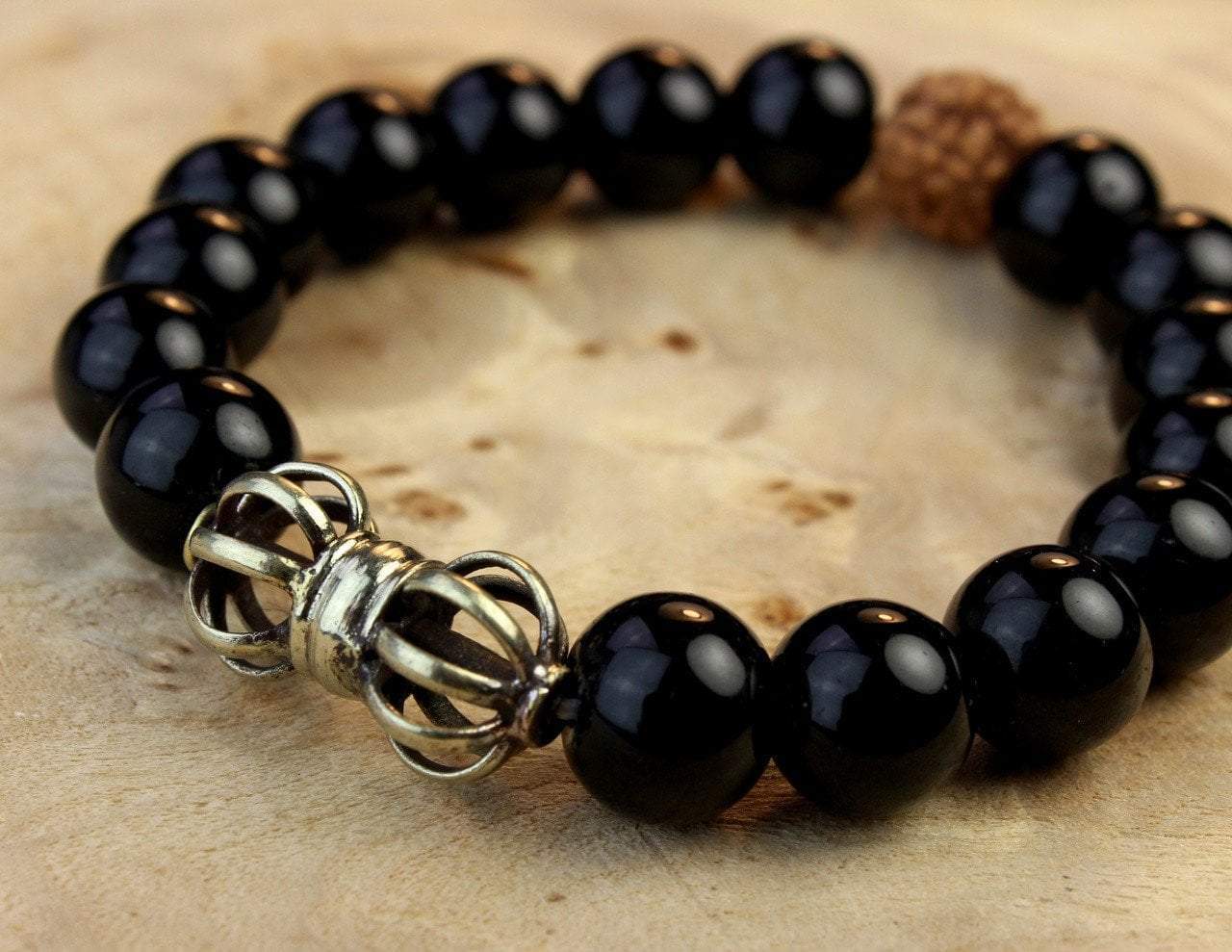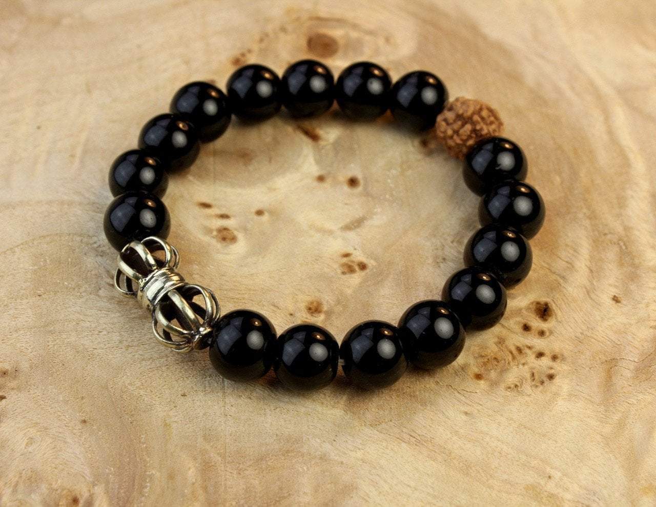 This wrist mala contains onyx beads and features a rudraksha seed and a dorje charm in the center.